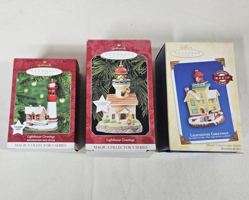 Group of ~3 assorted boxed Keepsake Magic Collector's Lighthouse Greetings Series Ornaments including 2, 4, & 8. Produced by Hallmark Cards, Inc.