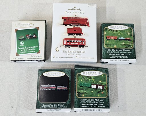 Group of ~5 assorted boxed Hallmark Keepsake Collector's Series Lionel Miniature Ornaments including Collector's Series Lionel 746 Norfolk and Western 1-3, The General, & The Red Comet Set. Produced by Hallmark Cards, Inc.
