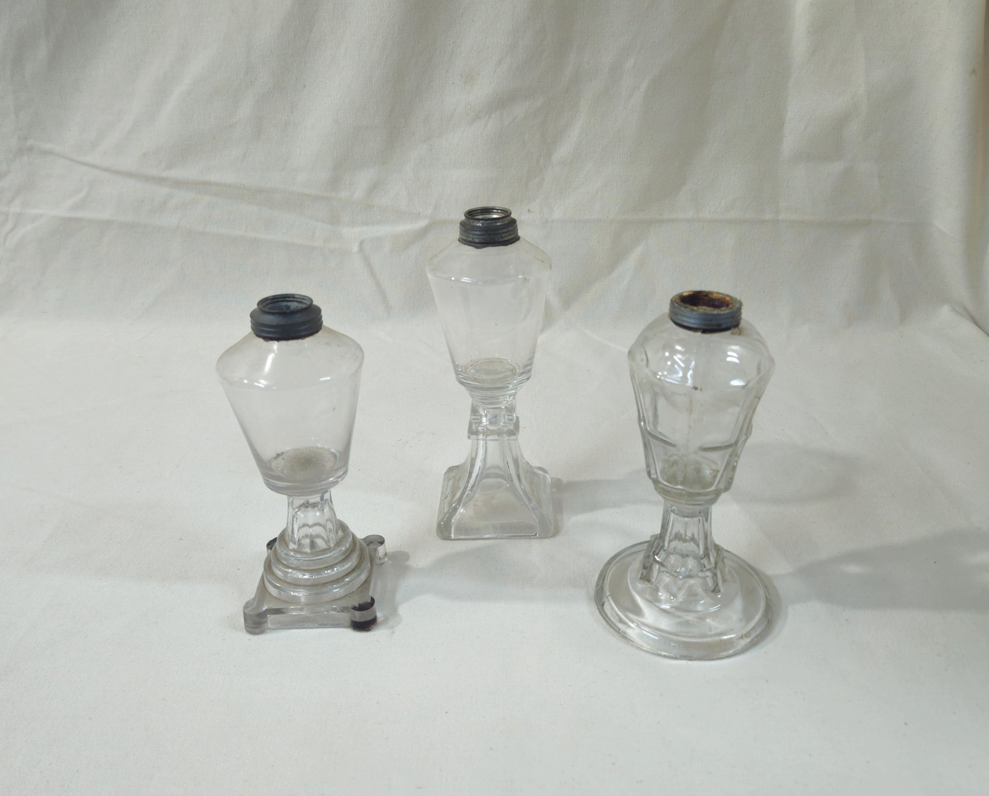 Group of assorted early American blown-molded flint glass whale oil table lamps with pewter collars. Produced by various South Boston/Cape Cod glass companies.