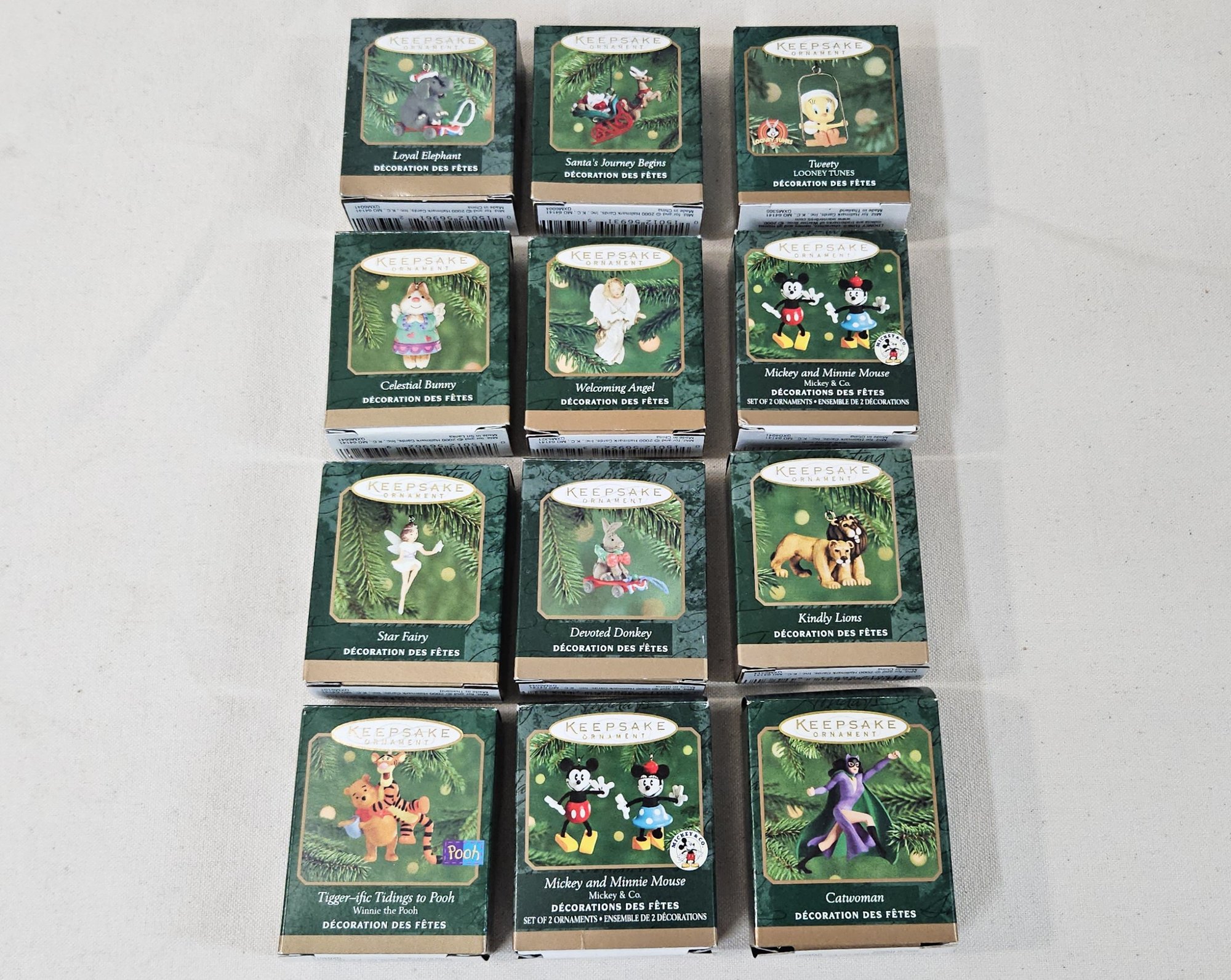 Group of ~12 assorted boxed Hallmark Keepsake Miniature Ornaments including Loyal Elephant, Santa's Journey Begins, Tweety, Celestial Bunny, Welcoming Angel, Mickey and Minnie Mouse (x2), Star Fairy, Devoted Donkey, Kindly Lions, Tigger-ific Tidings to Pooh, & Catwoman. Produced by Hallmark Cards, Inc.