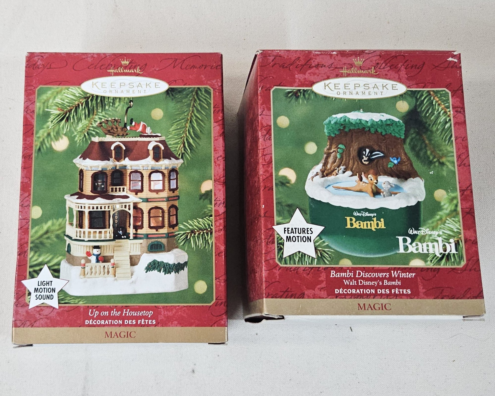 Group of ~2 boxed Keepsake Magic Ornaments including Up on the Housetop and Bambi Discovers Winter. Produced by Hallmark Cards, Inc.