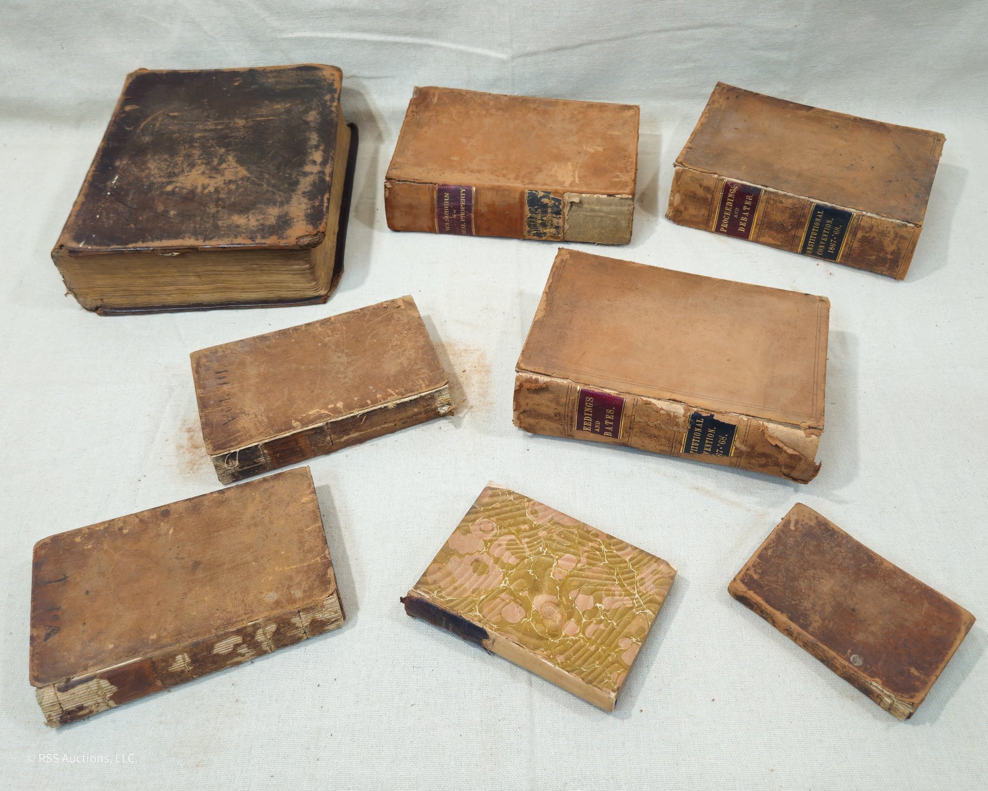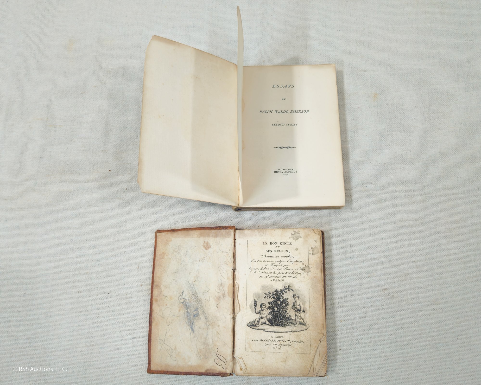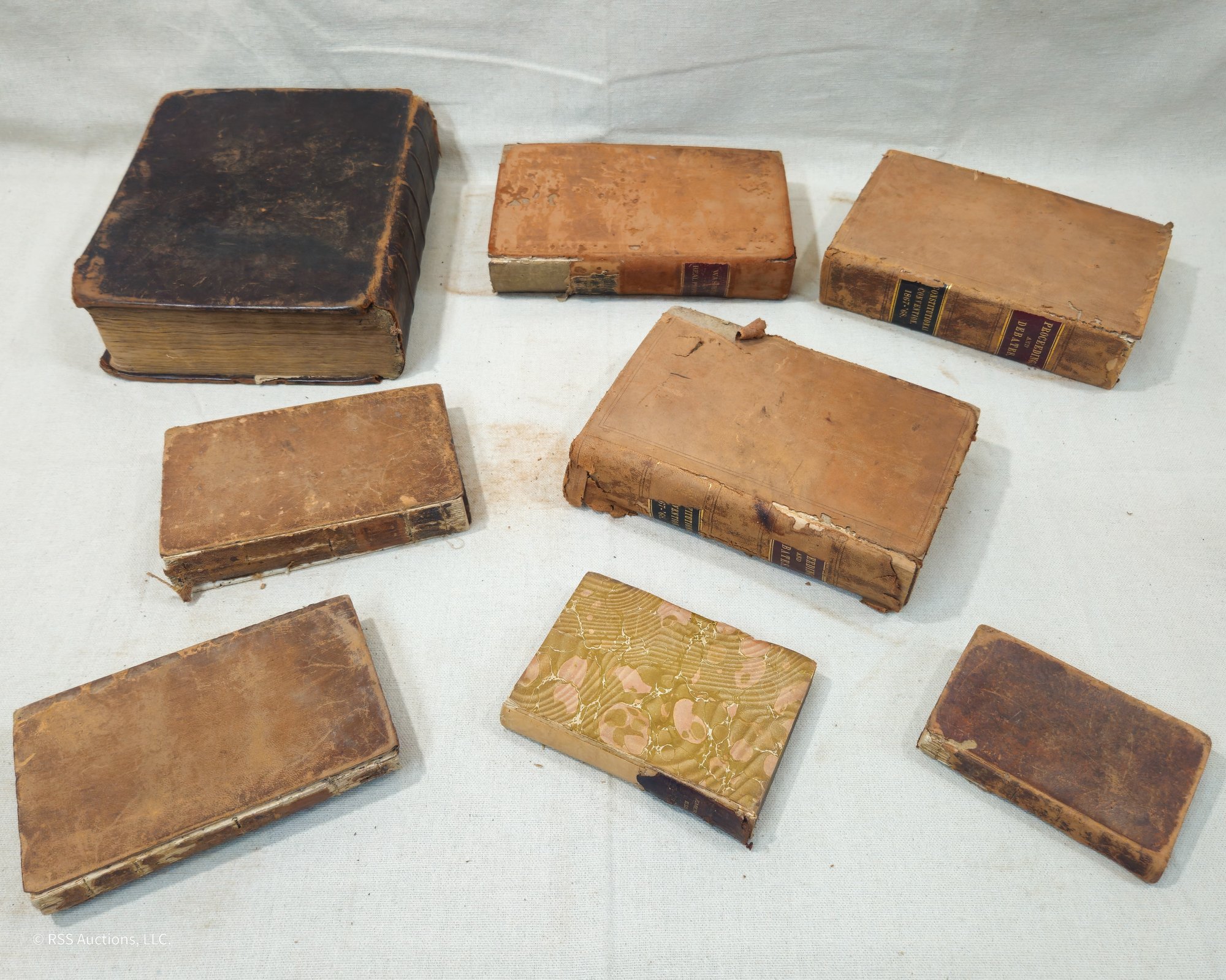 Notes: Assorted Antique 19th Century Leather Bound Books are pre-owned showing minor to heavy wear commensurate with age & use and individually in various stages of condition. Bible missing pages. Essays By Ralph Waldo Emerson missing front and back covers.