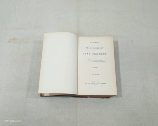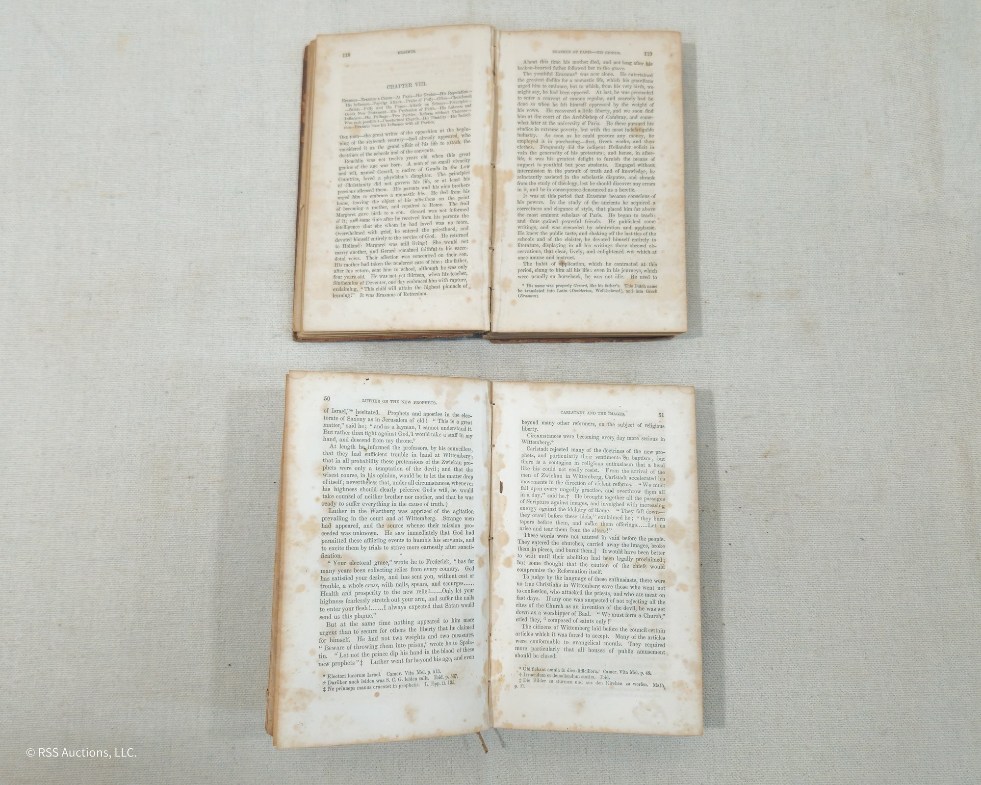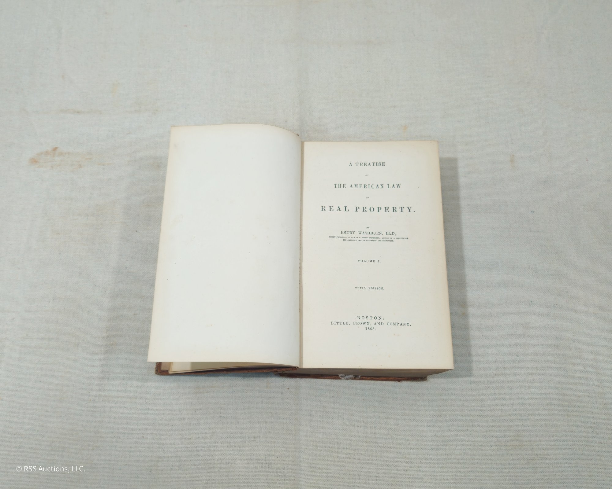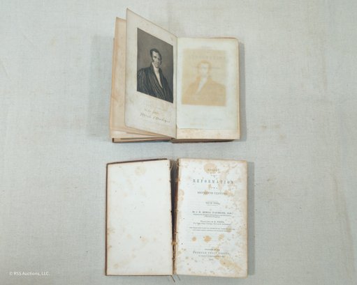 Group of ~8 assorted antique 19th century leather bound books including a Bible, a third edition 1868 Emory Washburn's A Treatise on The American Law of Real Property Vol. 1, an 1868 Proceedings and Debates of the Constitutional Convention of the State of NY in the City of Albany Vol. III & V, an 1847 J.H. Merle D'Aubinge, D.D.'s History of the Reformation of the Sixteenth Century Vol. First & Third, an 1892 Essays by Ralp Waldo Emerson Second Series, and a French Le Bon Oncle et Ses Neveux (The Good Uncle and His Nephews.