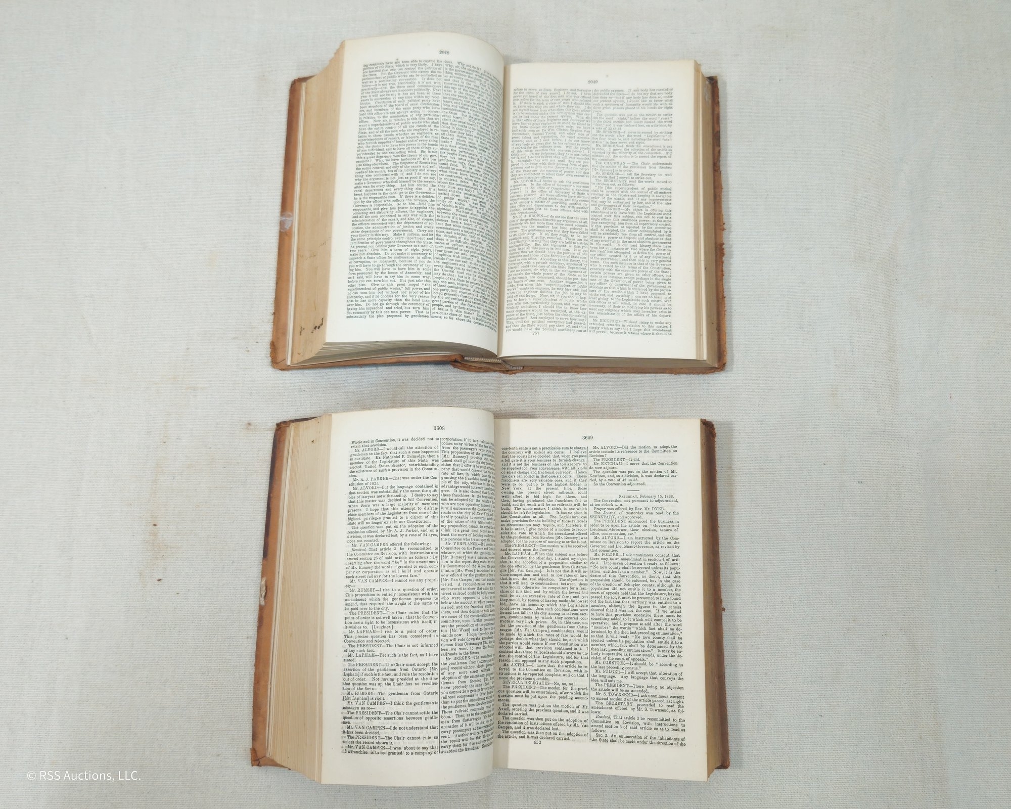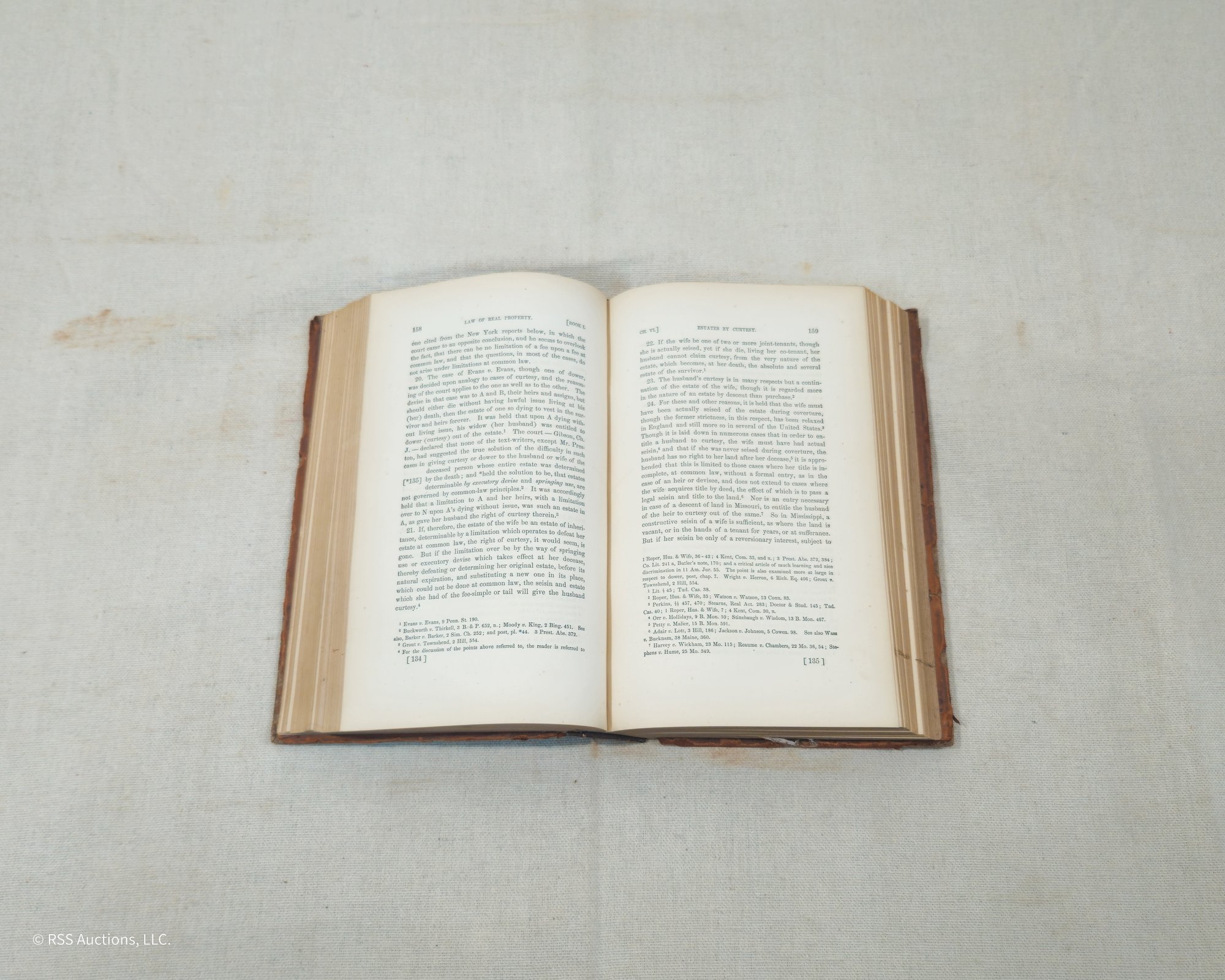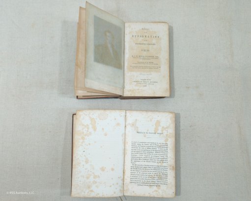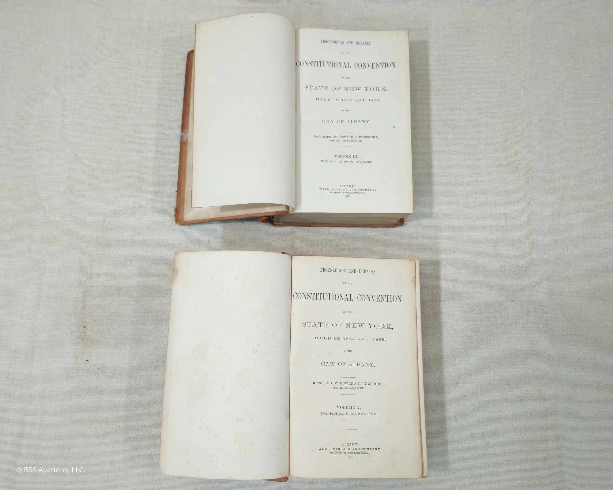 Group of ~8 assorted antique 19th century leather bound books including a Bible, a third edition 1868 Emory Washburn's A Treatise on The American Law of Real Property Vol. 1, an 1868 Proceedings and Debates of the Constitutional Convention of the State of NY in the City of Albany Vol. III & V, an 1847 J.H. Merle D'Aubinge, D.D.'s History of the Reformation of the Sixteenth Century Vol. First & Third, an 1892 Essays by Ralp Waldo Emerson Second Series, and a French Le Bon Oncle et Ses Neveux (The Good Uncle and His Nephews.
