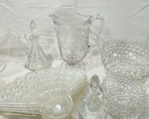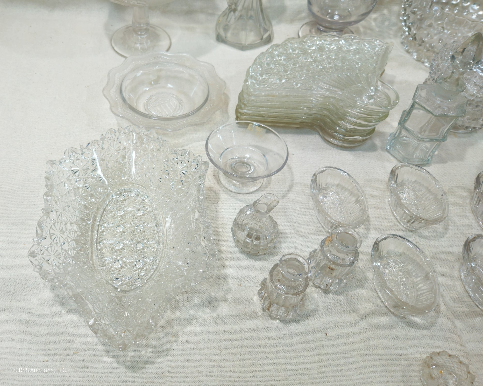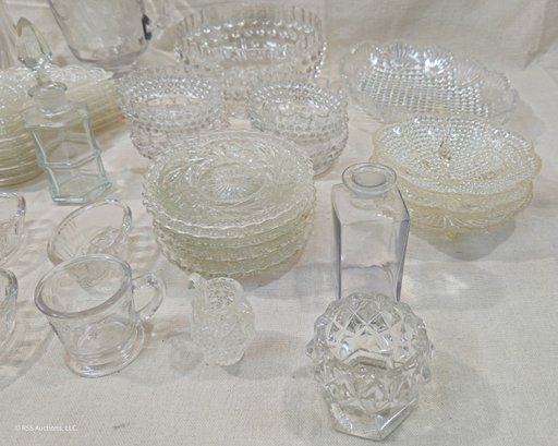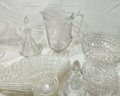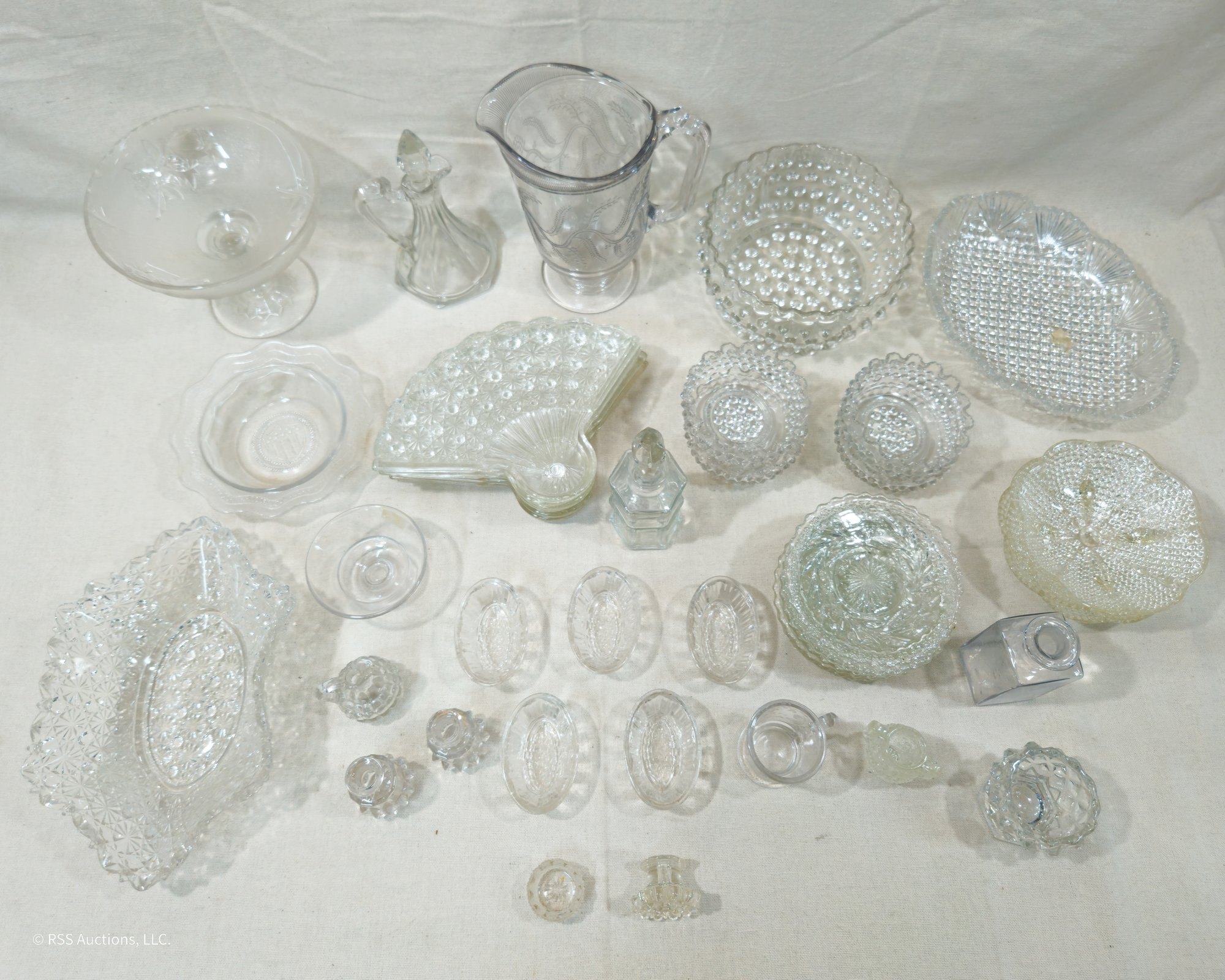 Group of ~30+ antique Early American Pattern Glass (EAPG) glassware including dishes, bowls, pitchers, compote, master salts, cruet, cologne bottle, and others in various patterns.