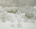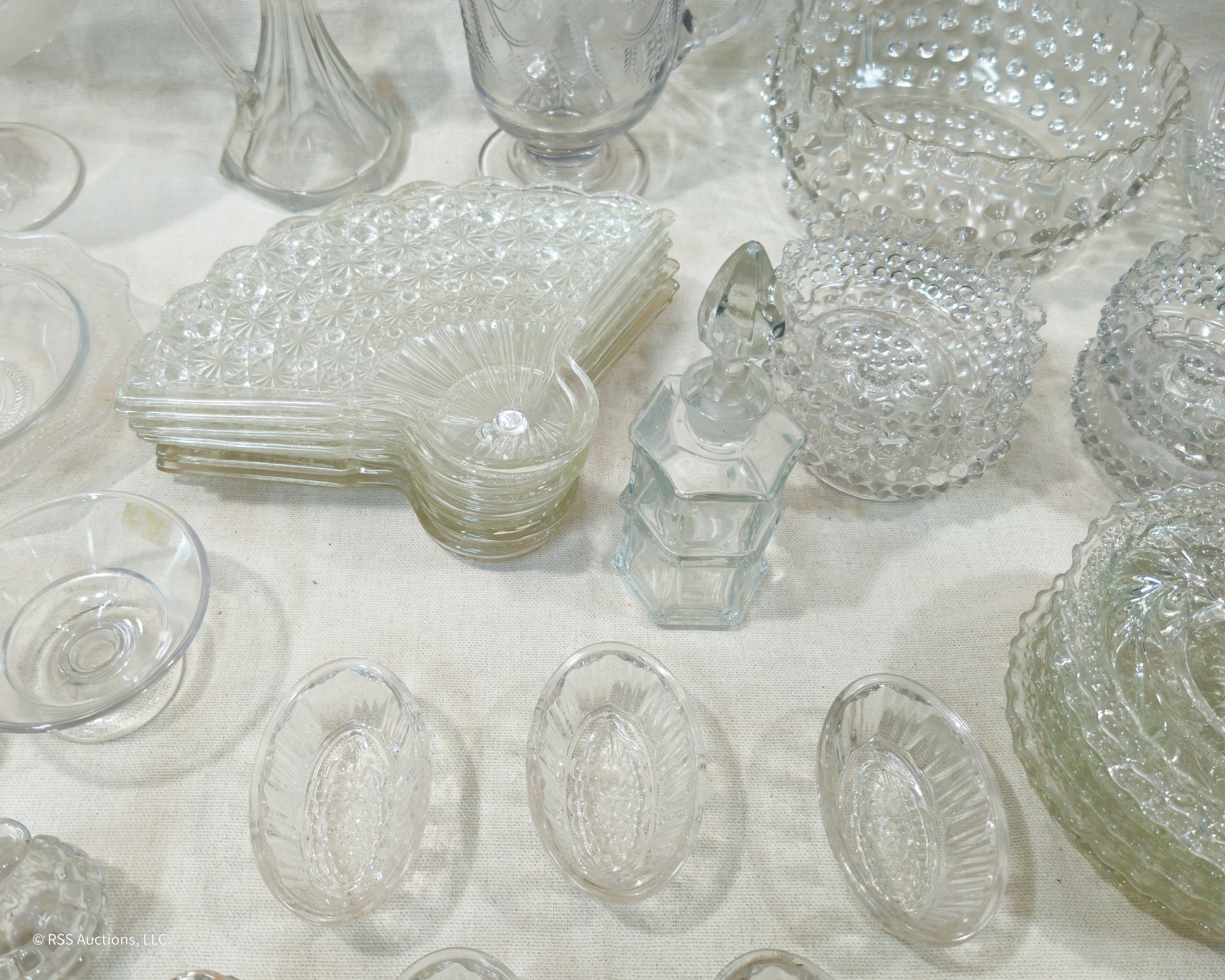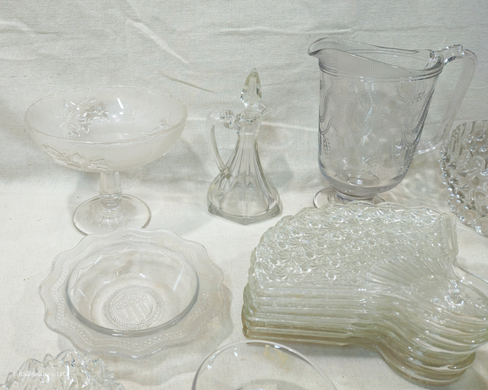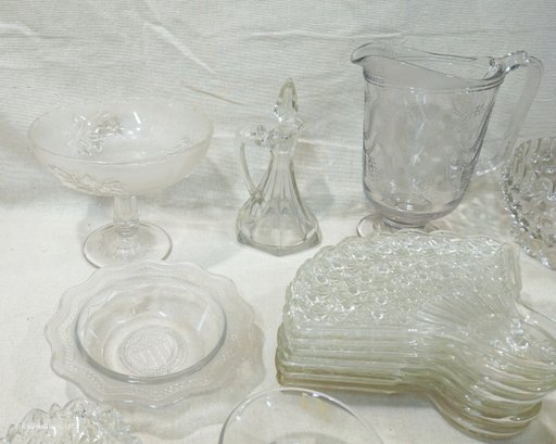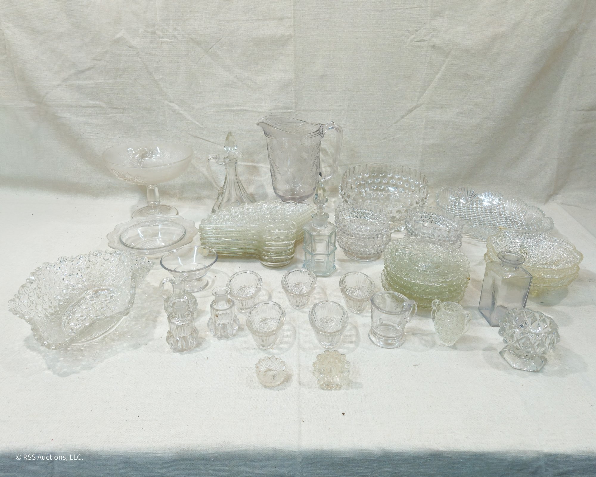 Group of ~30+ antique Early American Pattern Glass (EAPG) glassware including dishes, bowls, pitchers, compote, master salts, cruet, cologne bottle, and others in various patterns.