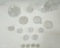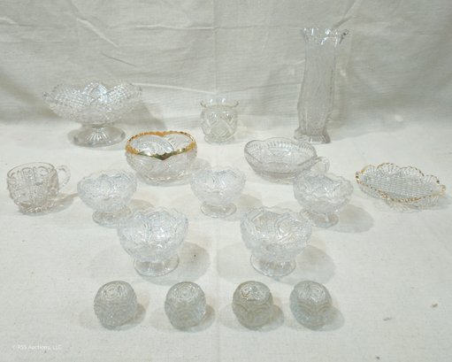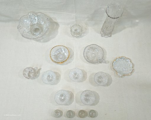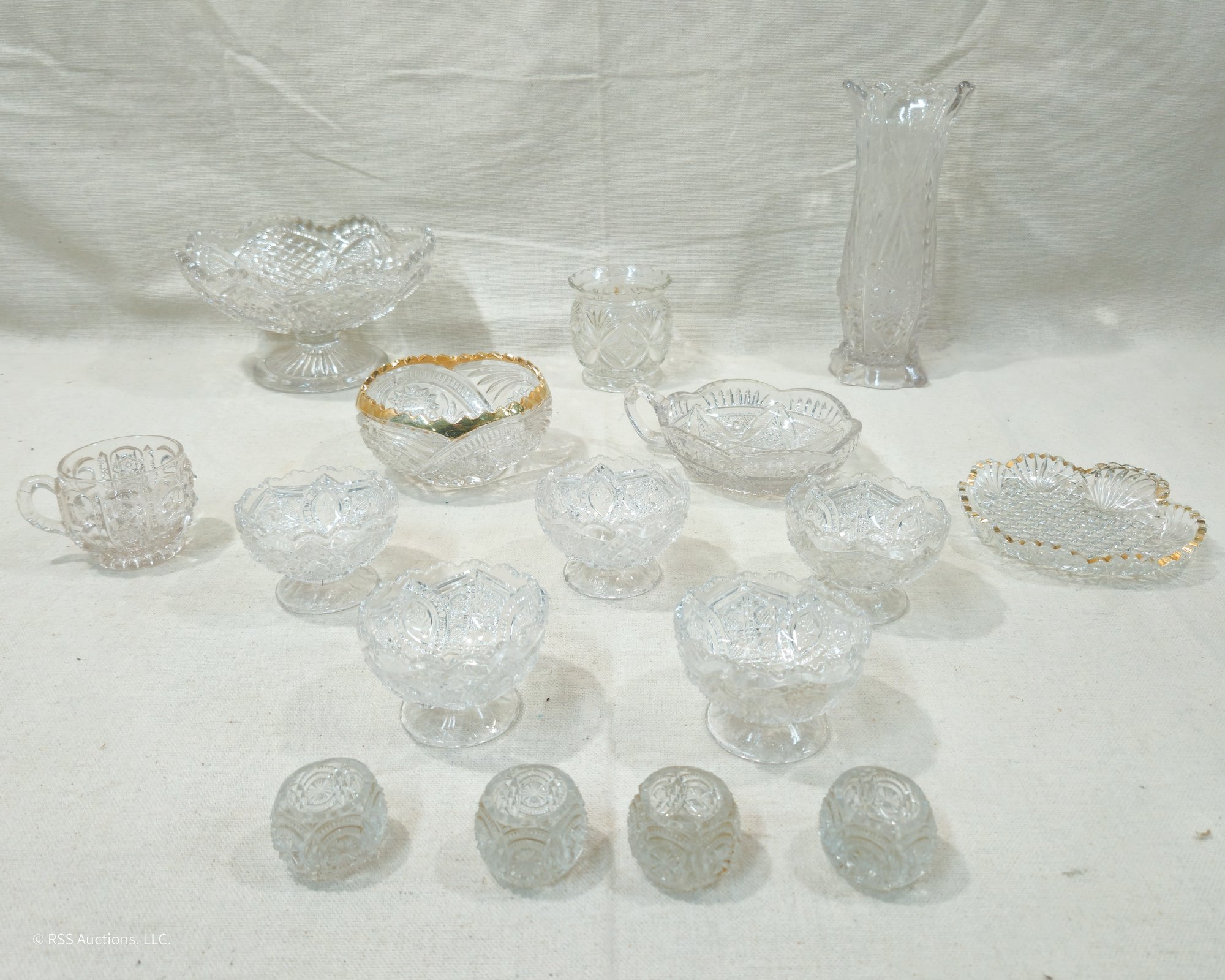 Group of ~16 assorted antique Prescut glassware including a tall vase, a compote, a gilt accented bowl, a small round bud vase, a handled dish, a gilt accented dish, a mug, 6 footed dishes, and 4 individual salts in various patterns.