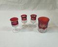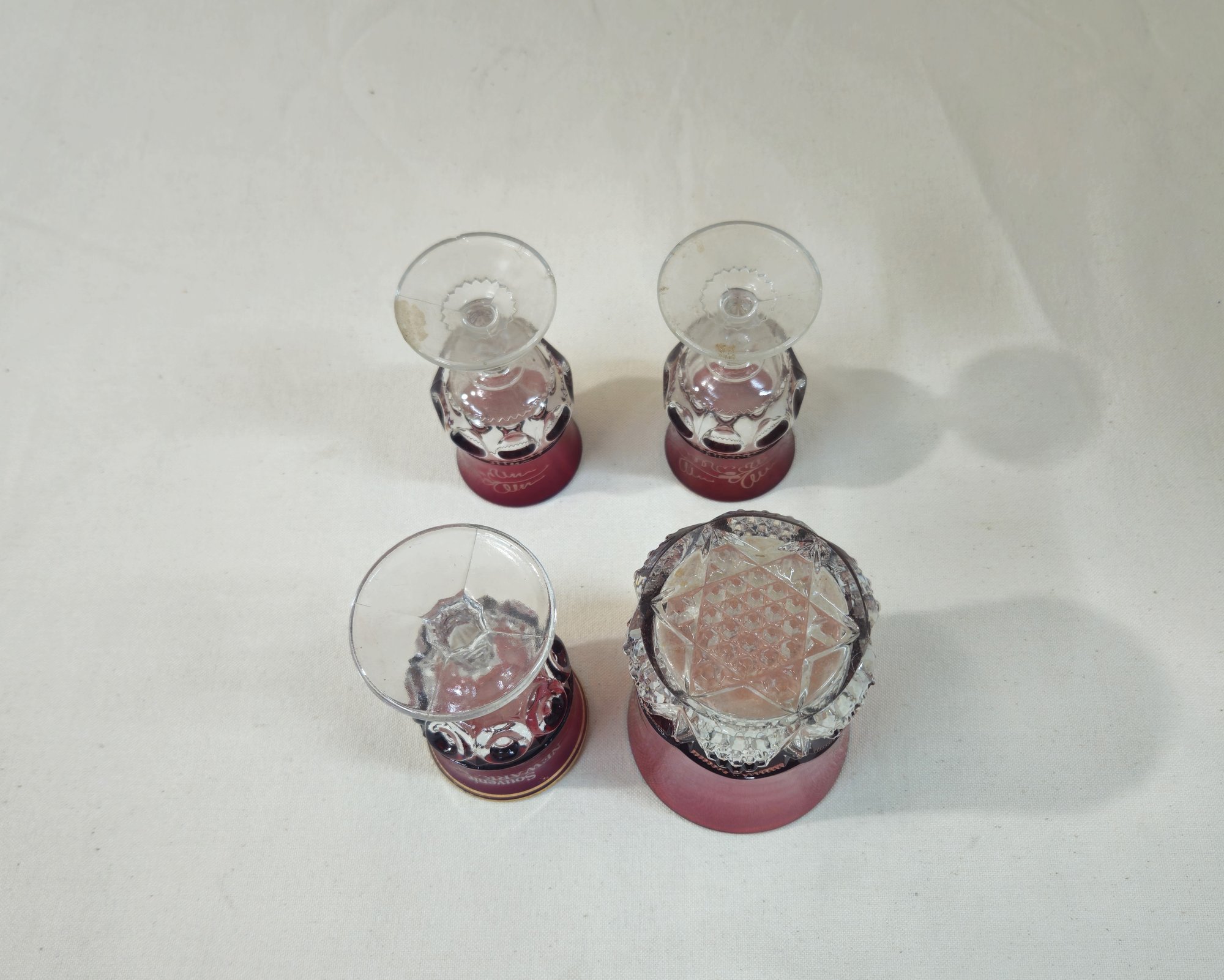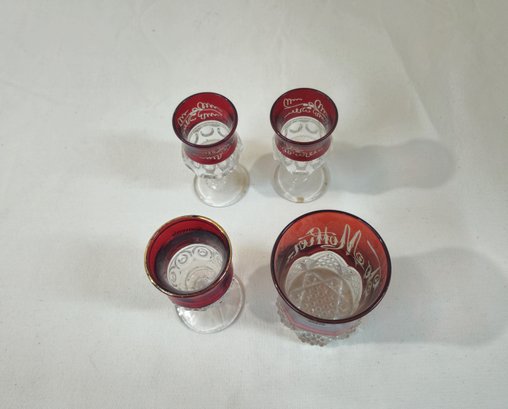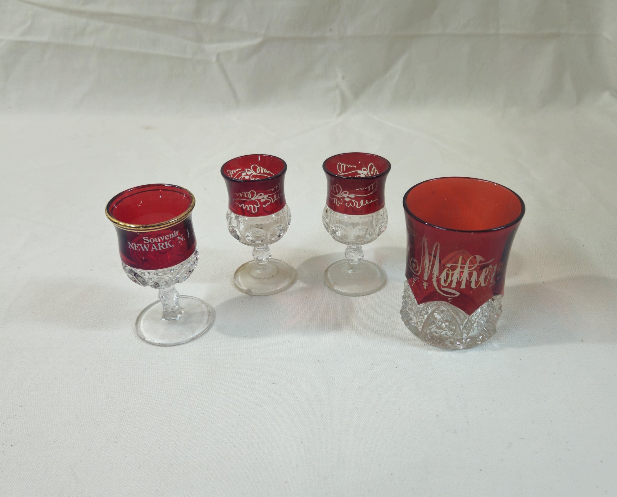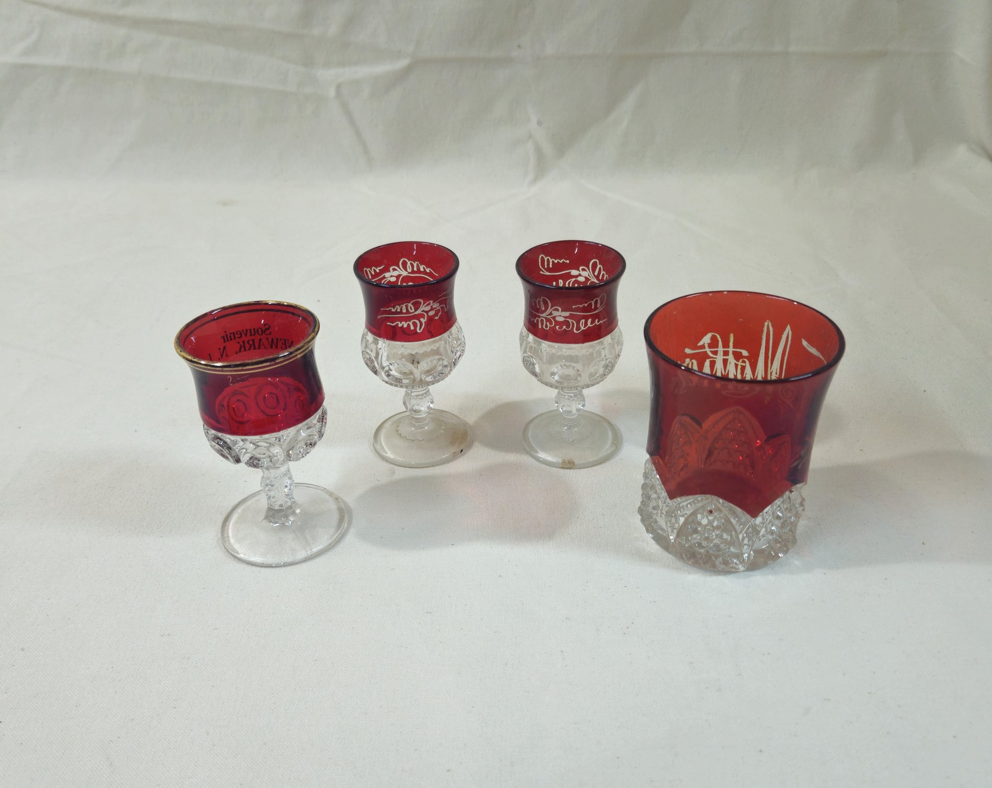 Group of assorted early American pressed glass (EAPG) ruby flashed etched souvenir glassware articles. Various makers.