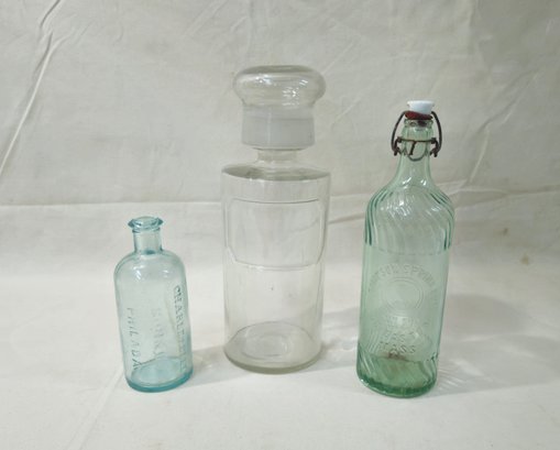 Group of assorted antique glass bottles including a Charles Ellis Son & Co. in aqua glass with disk lip, a handblown label under glass apothecary bottle/jar with lid in clear glass, and a Simpson Spring Co./So. Easton, Mass in aqua glass.