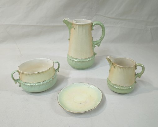 Group of assorted antique Hampshire Pottery tea/chocolate pot articles including tea/chocolate pot (no lid), creamer, sugar (no lid), and a saucer. Sugar bowl impressed with Hampshire on base and creamer impressed with J.S.T. & Co./Keene, NH.