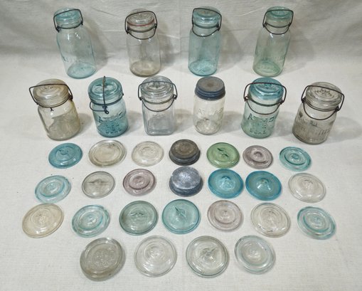 Group of ~35 assorted antique & vintage canning fruit jars & lids with 10 jars including Lightning, Atlas E-Z Seal, Atlas Strong Shoulder, Queen, Double Safety in aqua & clear glass, and 25 various misc. lids.