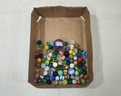 Group of assorted antique & vintage glass marbles including a handmade rabbit/hare sulphide marble in sun color amethyst glass, a handmade cobalt blue mica marble, and other assorted machine-made marbles.
