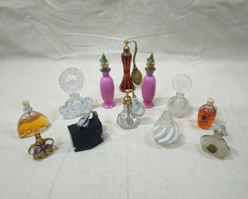 Group of ~12 assorted antique & vintage glass perfume bottles in various styles and from various manufacturers.