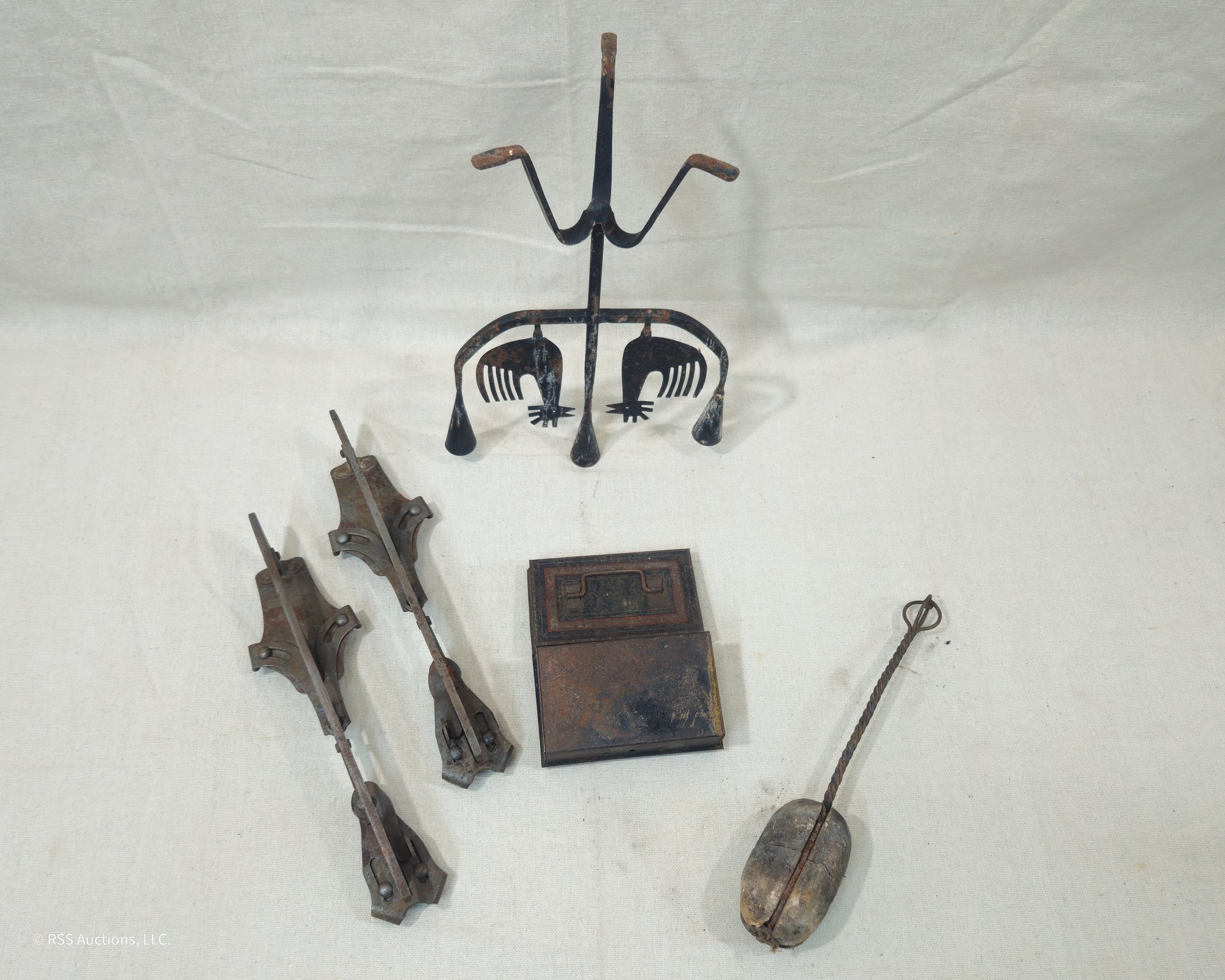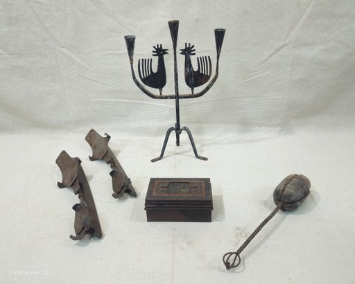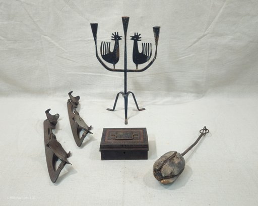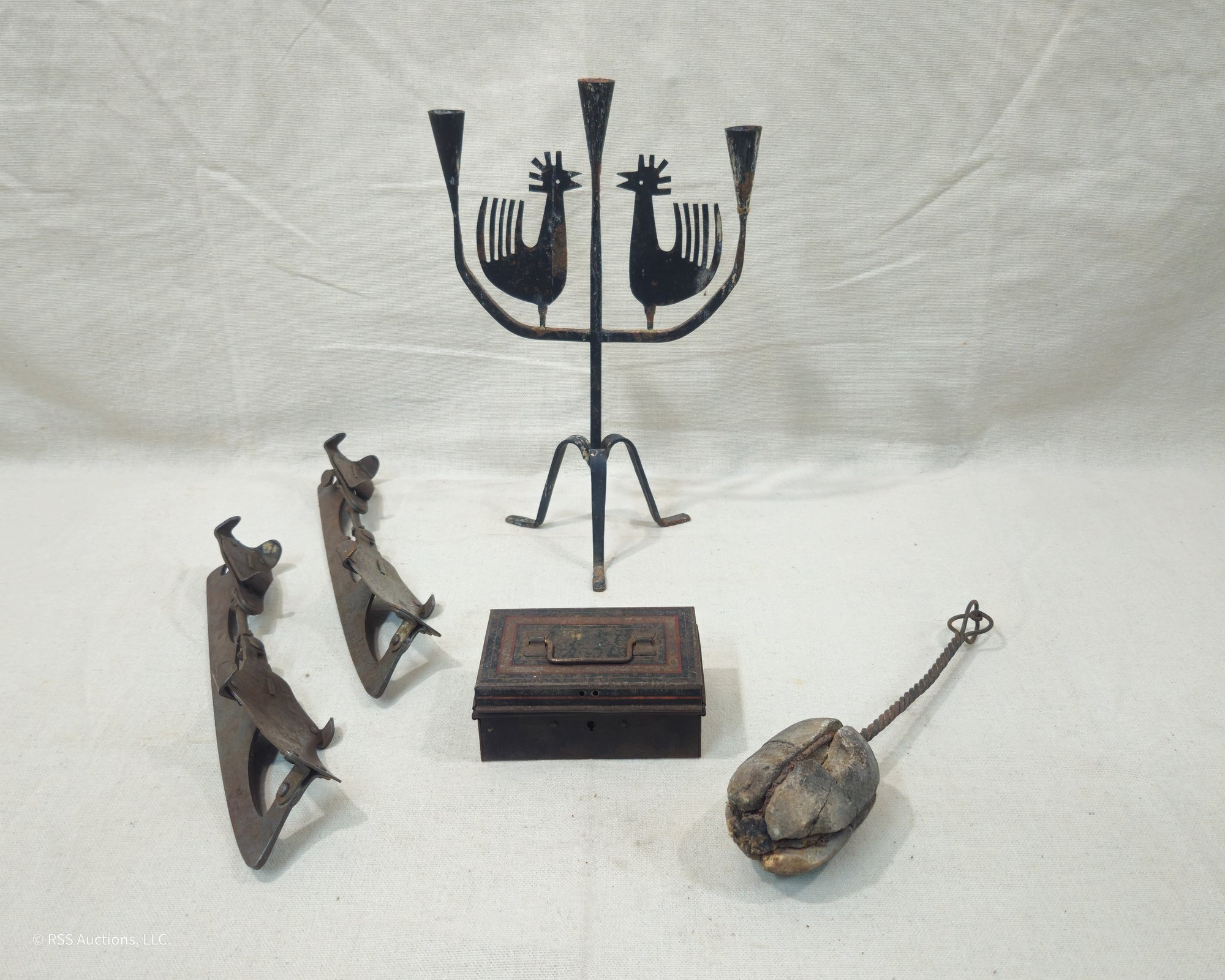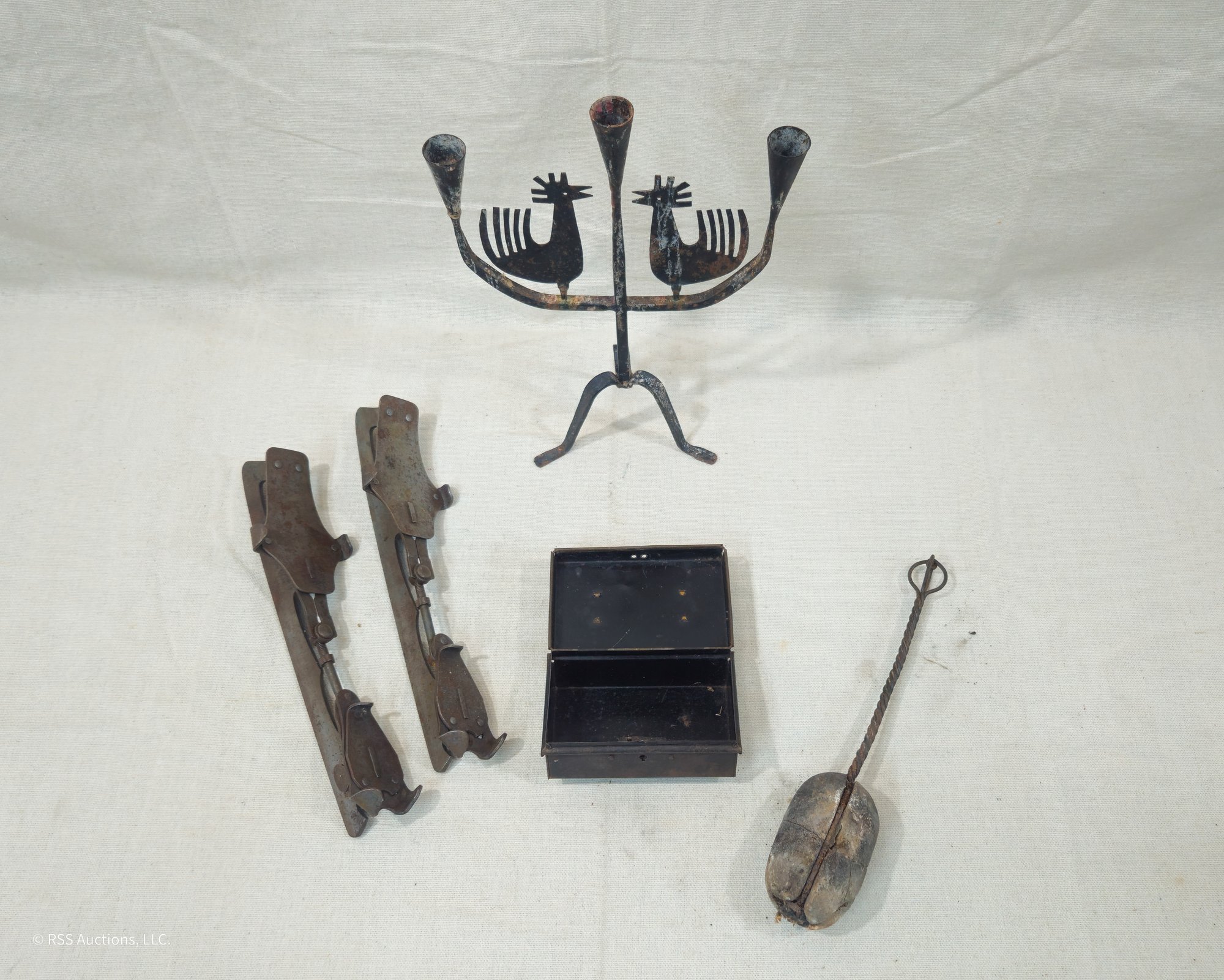 Group of ~5 assorted antique & vintage metalware including a pair of ice skates, a small metal box, an Eric Dalmas rooster candelabra, and a fire starter wand.