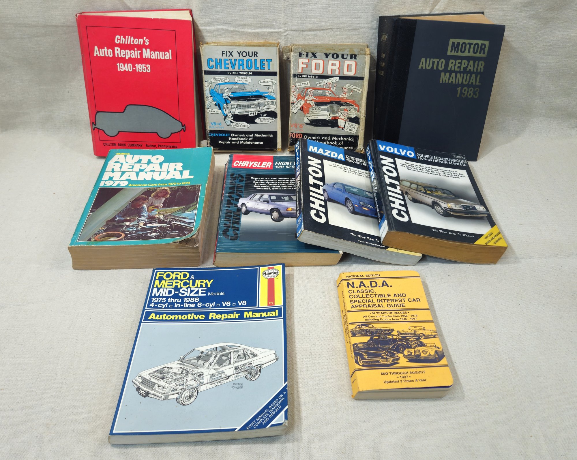 Group of ~10 automotive repair manuals including titles Fix Your Ford, Fix your Chevy, Chilton's Auto Repair Manual 1940-1953, Motor Auto Repair Manual 1983, Chilton's Auto Repair Manual 1979: American Cars from 1972 to 1979, Chilton's Chrysler FWD 1981-1992 Repair Manual, Chilton's Mazda 323/MX-3/626/MX-6/Millenia/Protege 1990-98 Repair Manual/Chilton Volvo Coupes/Seans/Wagons 1970-1989 Repair Manual, Haynes Ford & Mercury Mid-Size Models 1975 thru 1986 Automotive Repair Manual, and a NADA 1997.