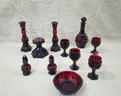 Group of assorted 1876 Cape Cod Collection glassware articles including 6 salad plates, decanter with stopper, salt & pepper, ~4 wine glasses, 2 candlesticks, hurricane lamp with globe, and a dessert bowl. Produced by Avon.