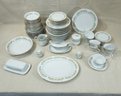 Group of ~74 assorted Bell Flower 2999 fine China tableware including 8 dinner plates, 8 lunch/salad plates, 8 bread & butter/snack plates, 8 soup bowls, 8 cereal bowls, 8 fruit/berry/sauce bowls, 7 teacups, 8 saucers, a serving bowl, an oval platter, salt & pepper, creamer & sugar with lid, gravy boat with underplate, and a butter dish with lid. Produced by Fine China of Japan