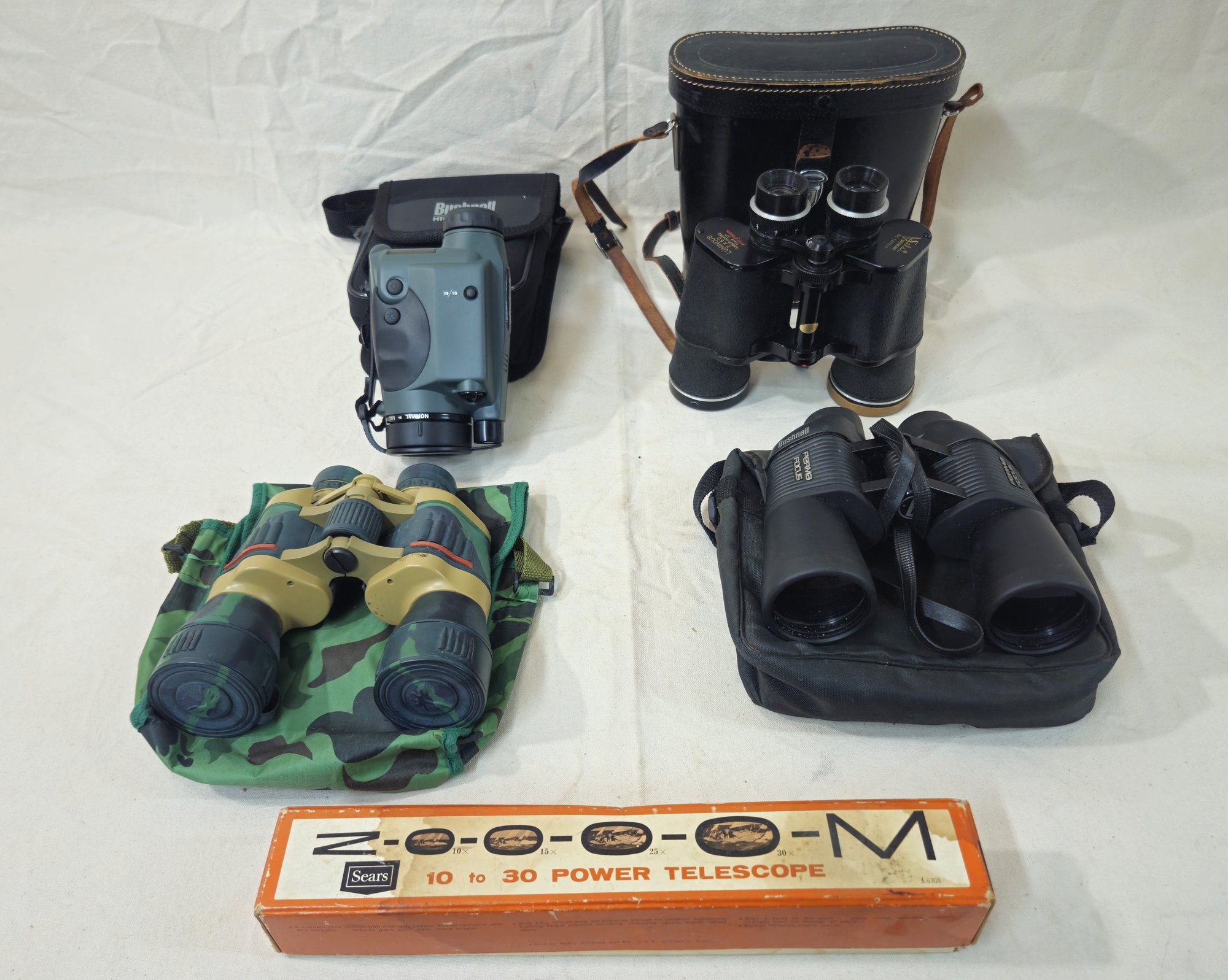 Notes: Assorted Binoculars & Night Vision Monocular are pre-owned showing signs of wear commensurate with age & use. Bushnell Night Vision monocular tested and working. Please review pictures.