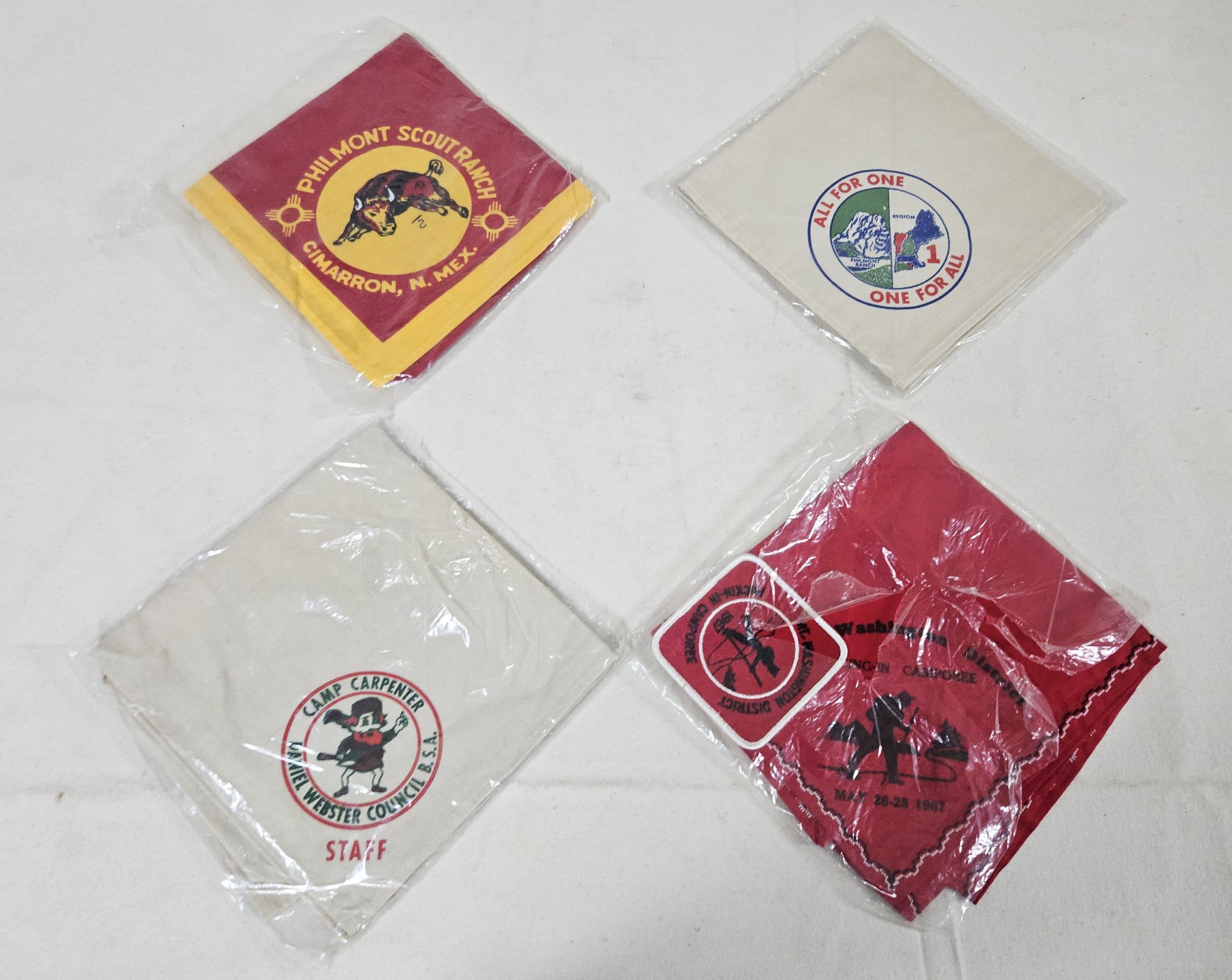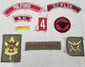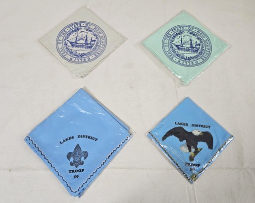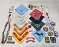 Group of assorted Boy Scouts of America collectibles including neckerchiefs, neckerchief slides, patches, and others.