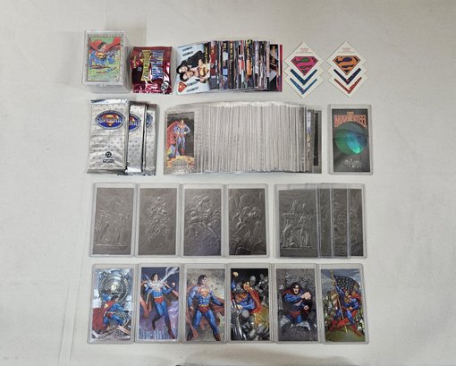 Group of assorted complete DC Superman trading cards base sets including The Return of Superman, Lois & Clark: The New Adventures of Superman, and Superman: The Man of Steel Platinum Series Premium Edition with Forged in Steel insert set (x2), Spectra-Etch insert set, and Skydisc SD3. Distributed by Skybox International.