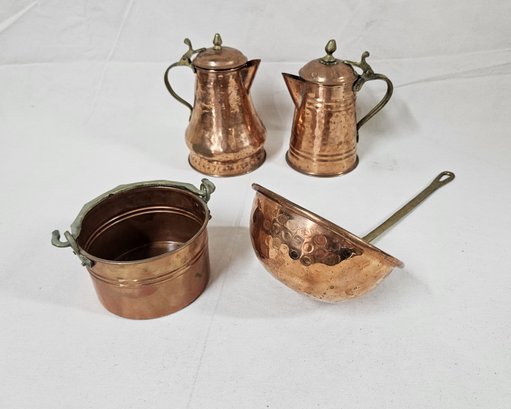 Group of assorted contemporary decorative copperware articles including 2 Hammered coffee pots, hammered ladle, & a handled small pot.