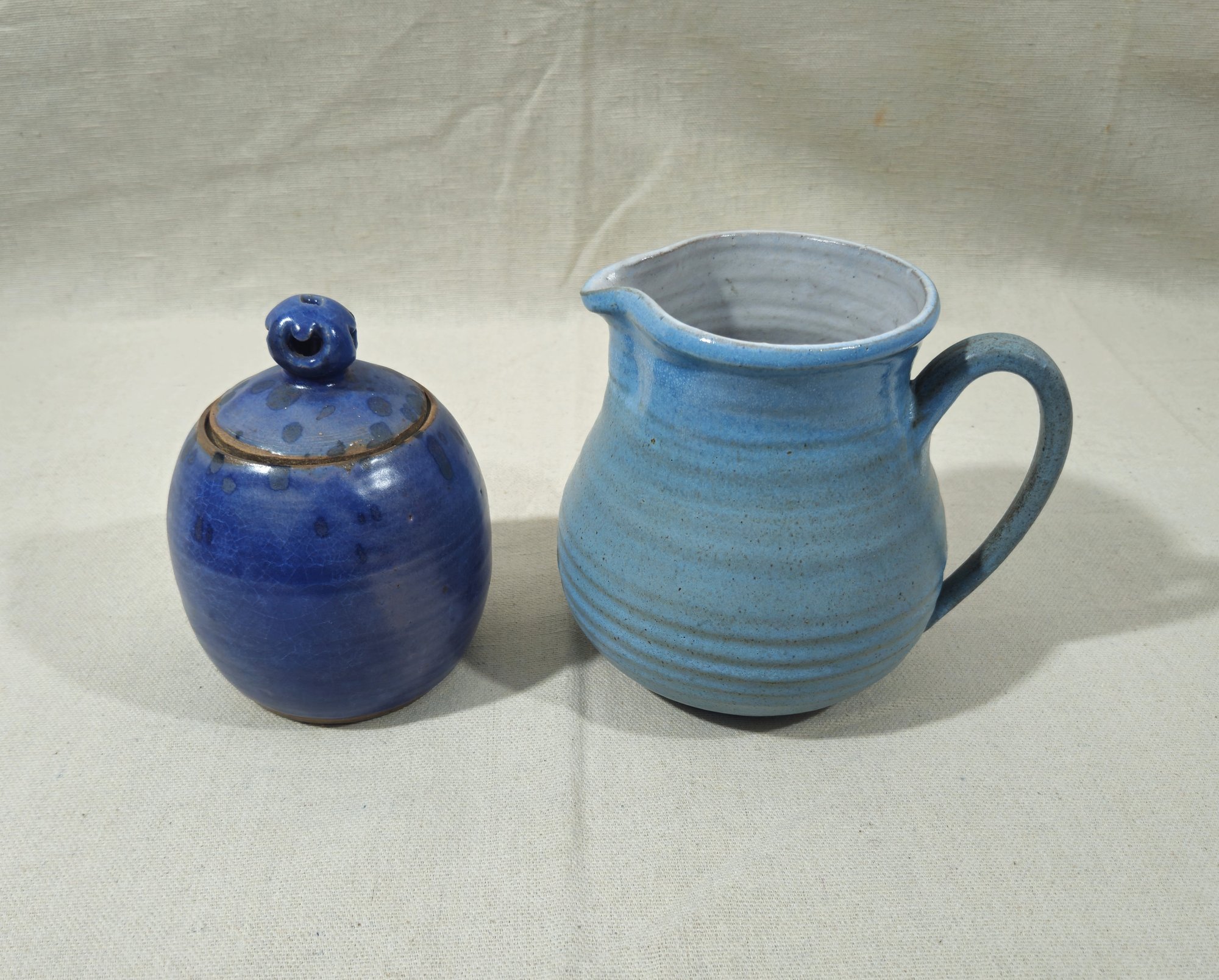 Assorted group of ~2 contemporary studio pottery articles including a covered jar in dark blue glaze and a light blue creamer/pitcher. Creamer/pitcher marked GES 763 on base.