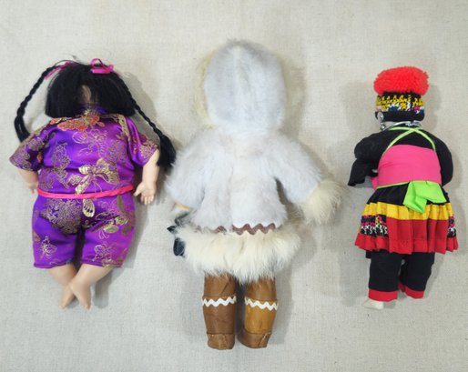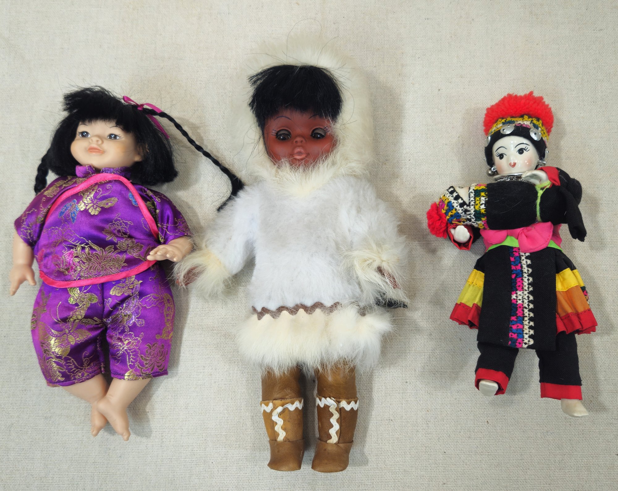 Assorted dolls including a Carlson Inuit Doll, The China Doll Co. Asian baby doll, and a Thai folk art porcelain doll.