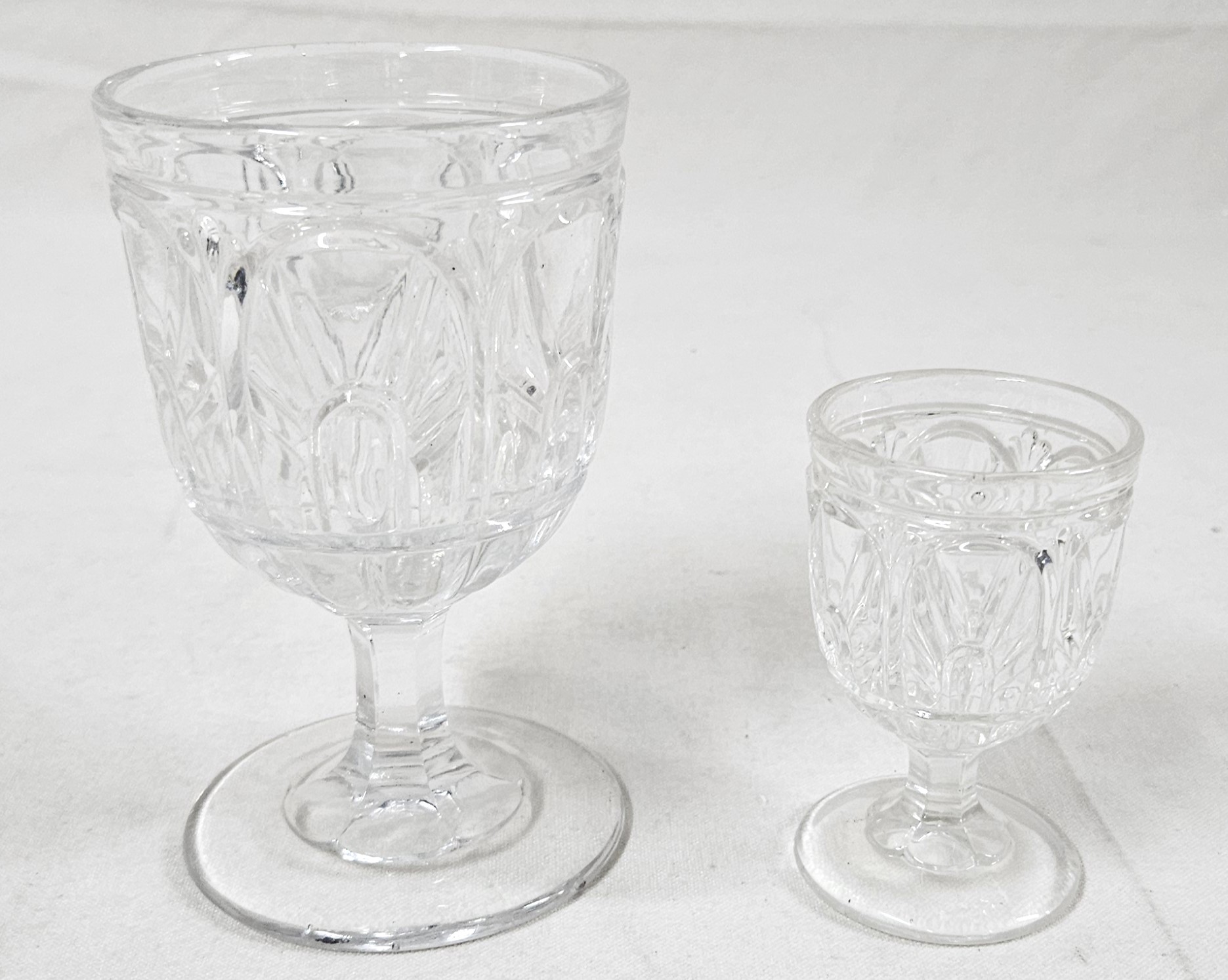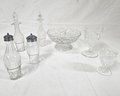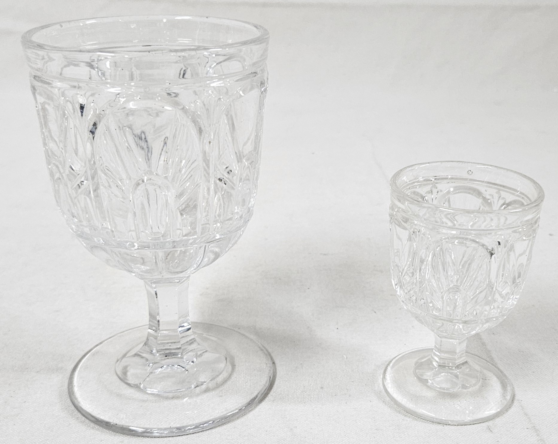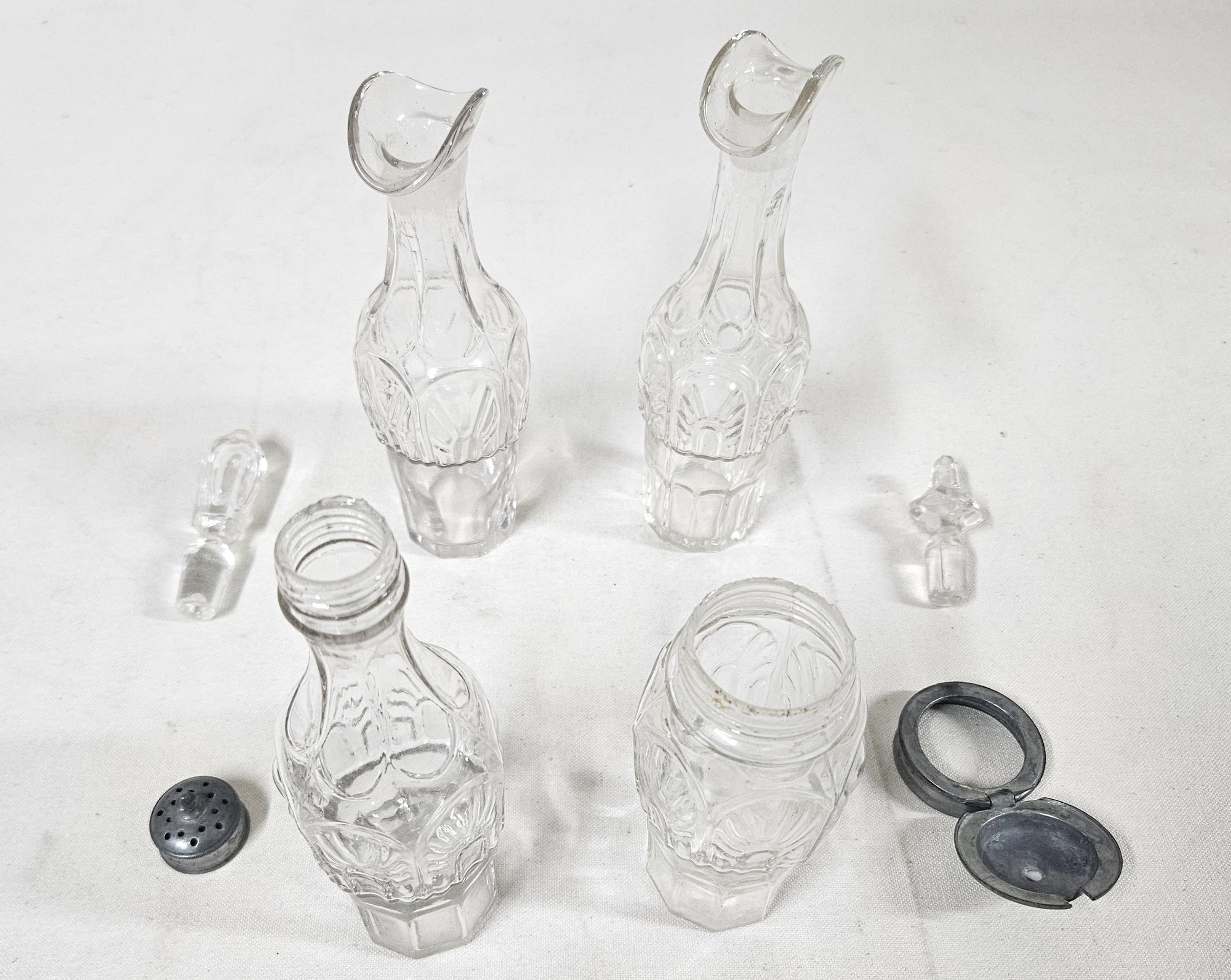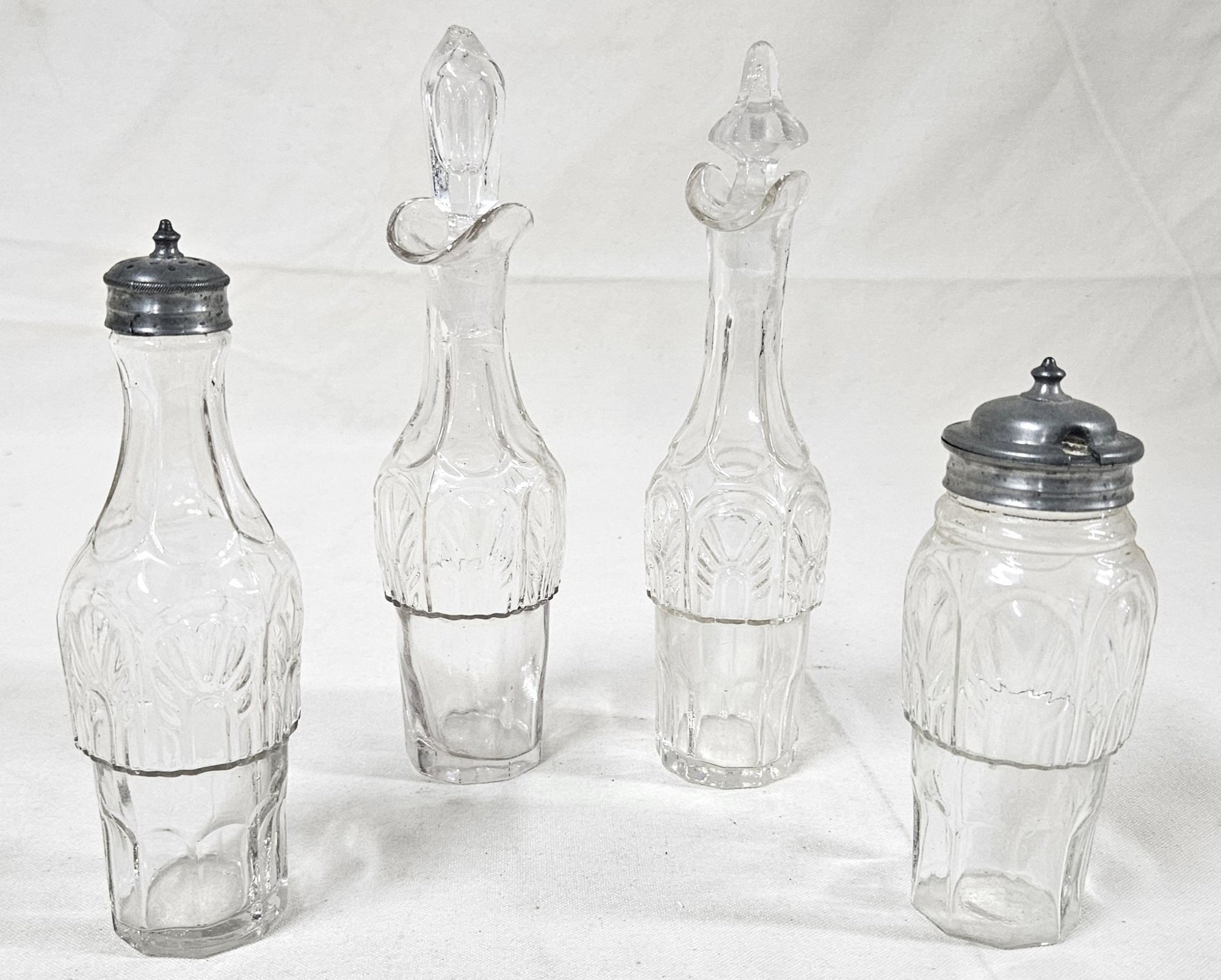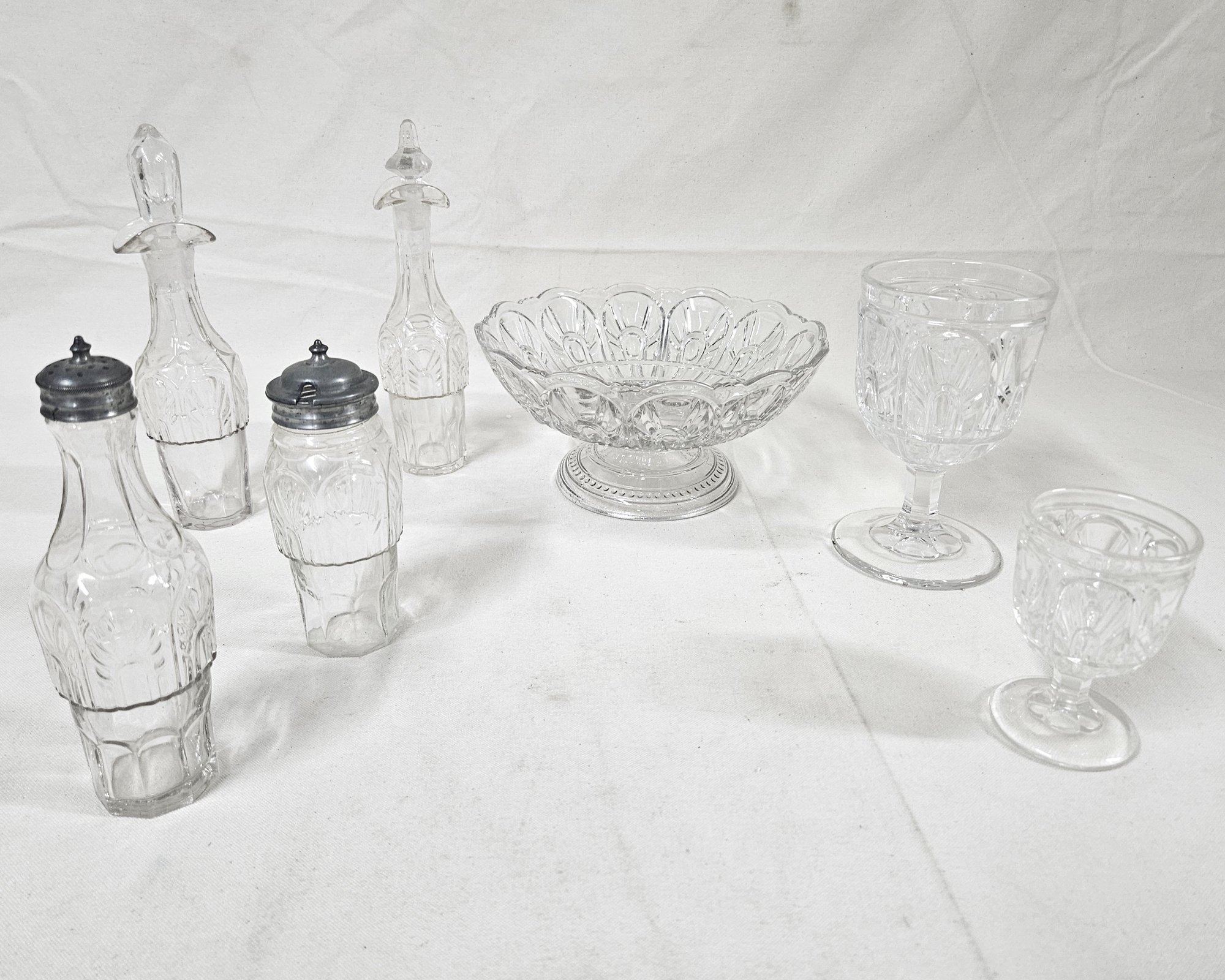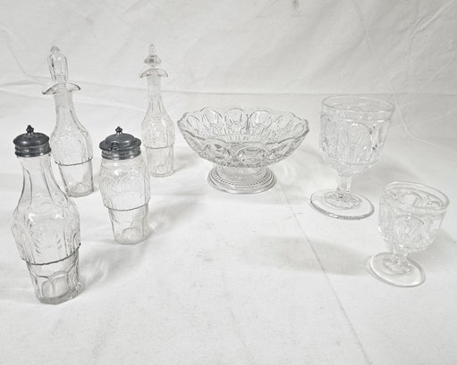 ~Group of ~7 assorted early American pressed glass Gothic articles in clear/colorless flint glass including an open compote on low standard, a goblet, an egg cup, and 4 bottles of a caster set. Possibly Union Glass Co. Somerville, MA