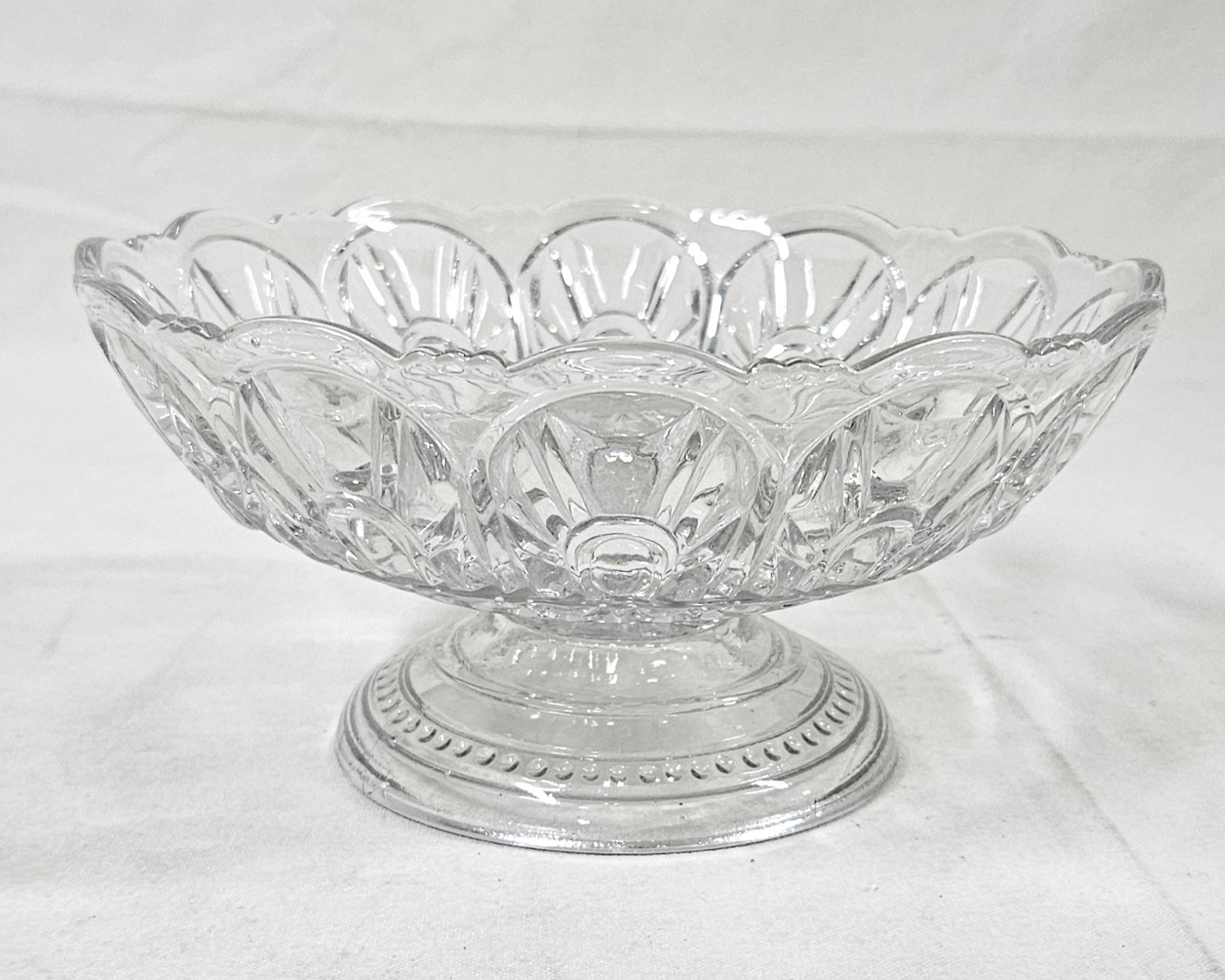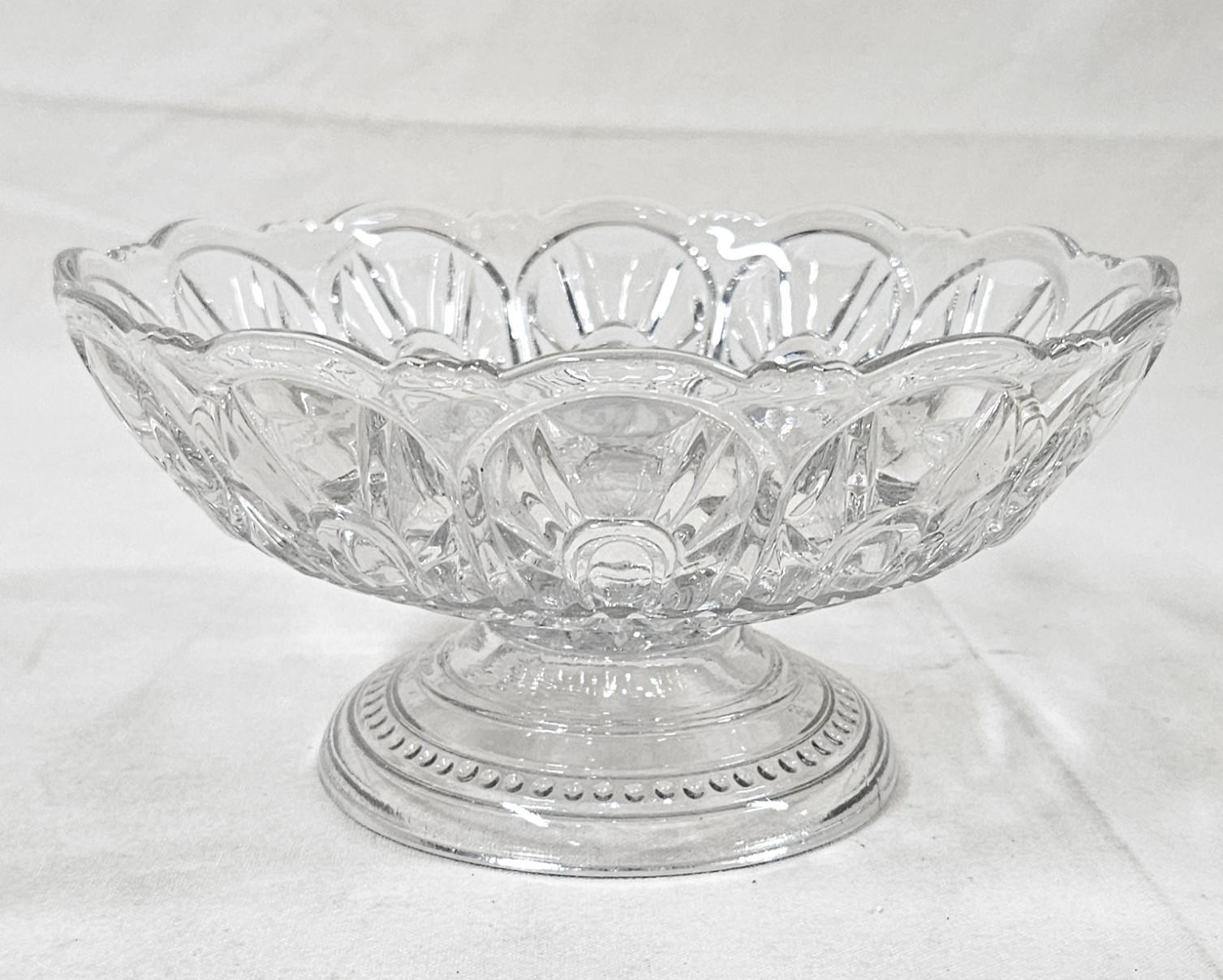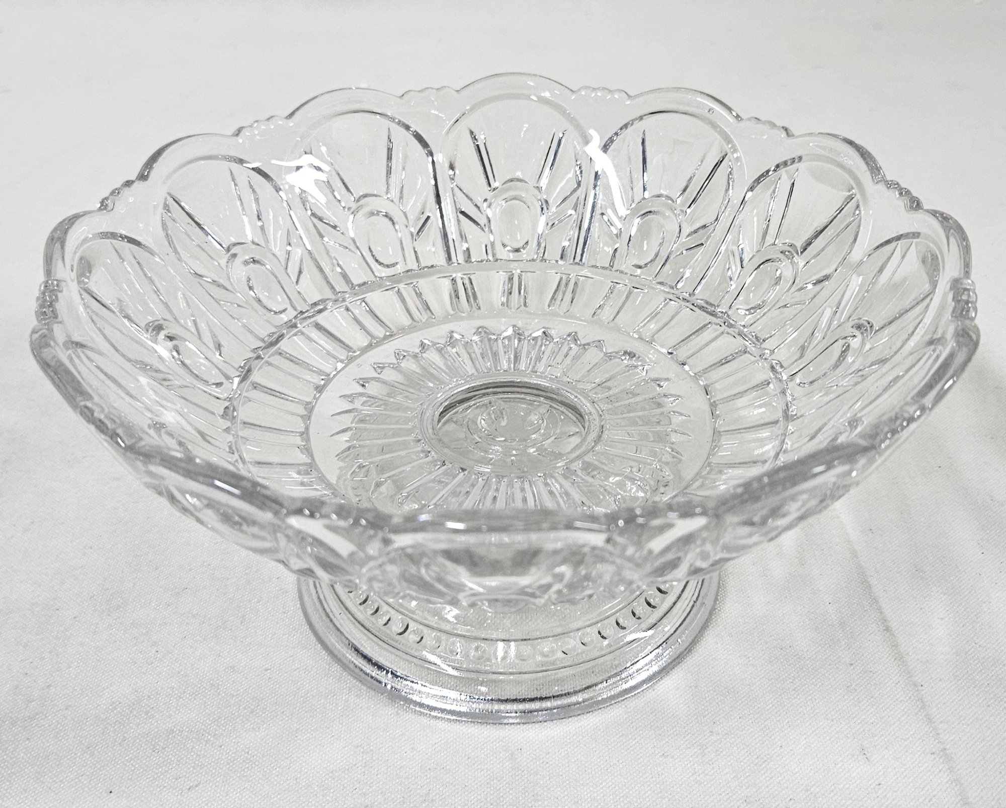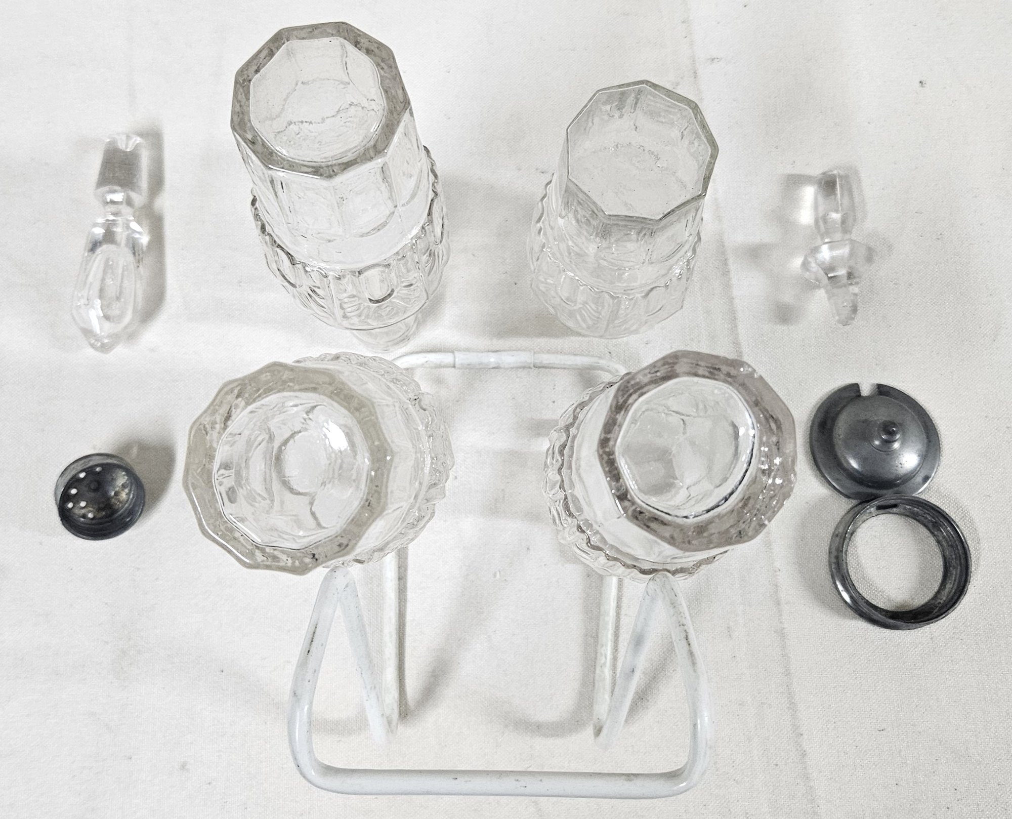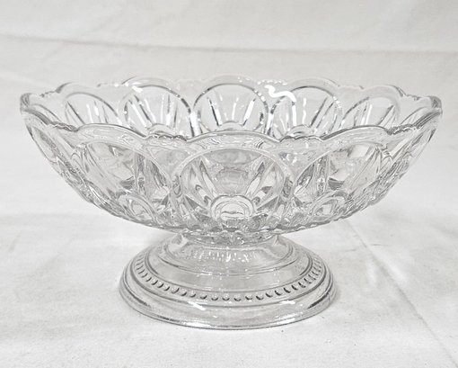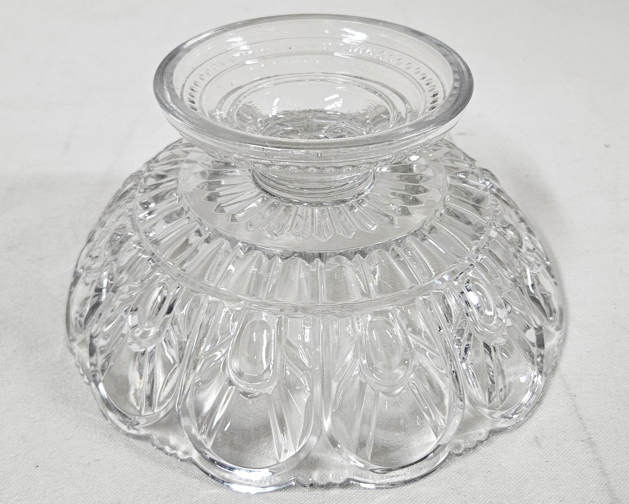 ~Group of ~7 assorted early American pressed glass Gothic articles in clear/colorless flint glass including an open compote on low standard, a goblet, an egg cup, and 4 bottles of a caster set. Possibly Union Glass Co. Somerville, MA