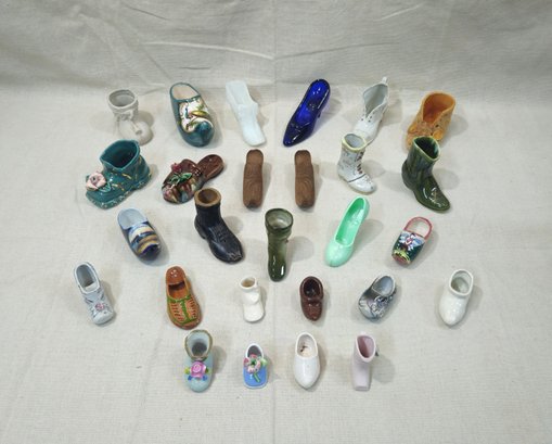 Group of ~27 assorted glass, ceramic, & other miniature novelty shoes in various styles and from various manufacturers.