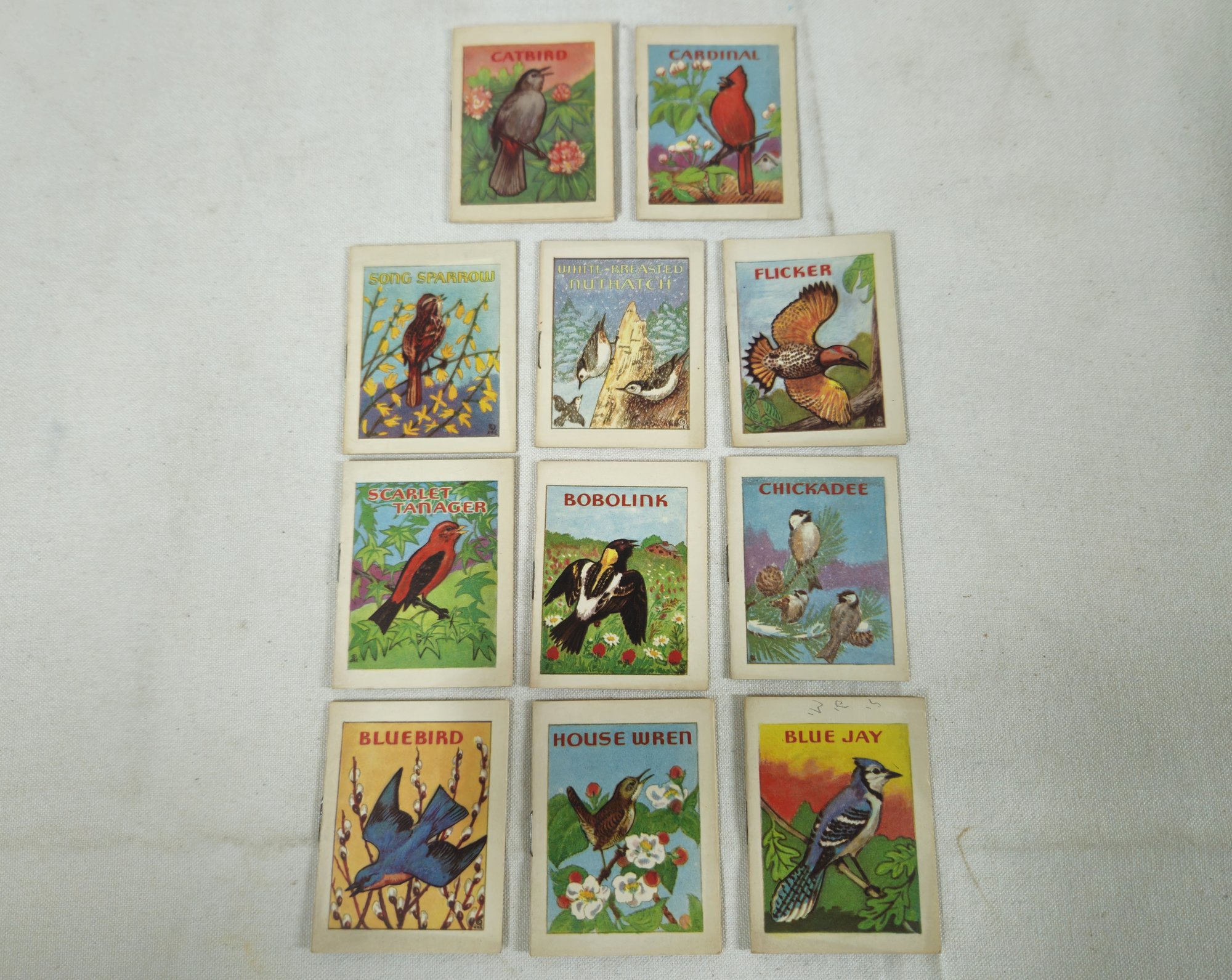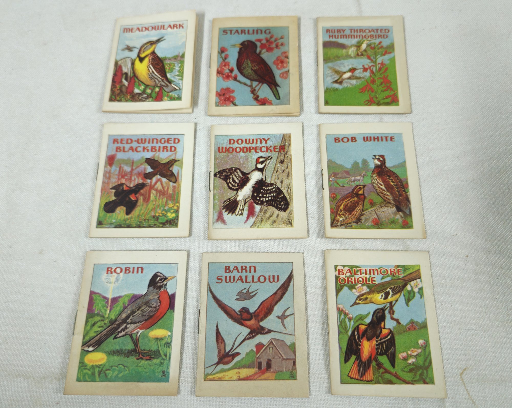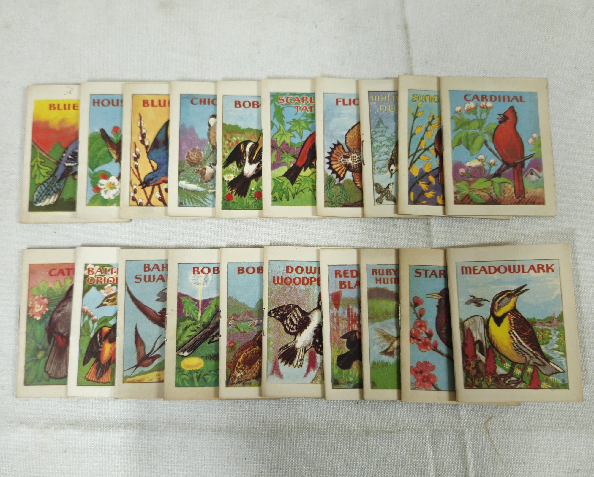 Group of ~20 assorted bird mini booklets including Catbird, Cardinal, Blue Jay, House Wren, Bluebird, Chickadee, Bobolink, Scarlet Tanager, Flicker, White breasted Nuthatch, Song Sparrow, Baltimore Oriole, Barn Swallow, Robin, Bob White, Downy Woodpecker, Red-Winged Blackbird, Ruby Throated Hummingbird, Meadowlark, and Starling published by Samuel Lowe Company, and copyrighted by John. H. Eggers.
