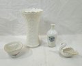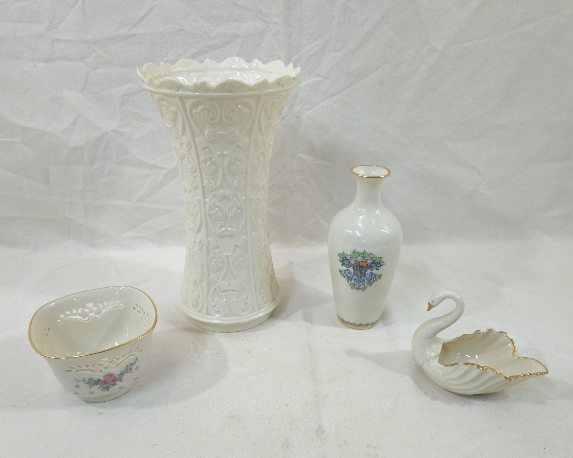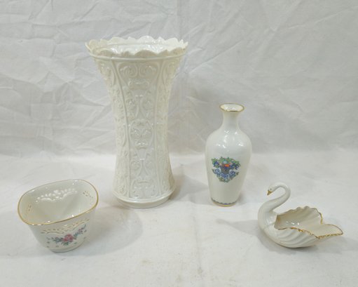 Group of ~4 assorted Lenox China including an 11" Wentworth Collection vase, 4" Swan bowl, a 7" Autumn bud vase, and a Petite Rose pierced treat cowl. All marked on base with Lenox logo stamps.