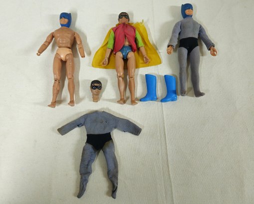 Group of assorted Mego action figures including DC & Marvel comic characters and other parts.