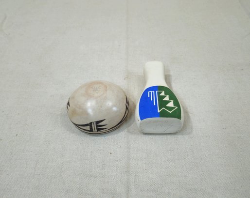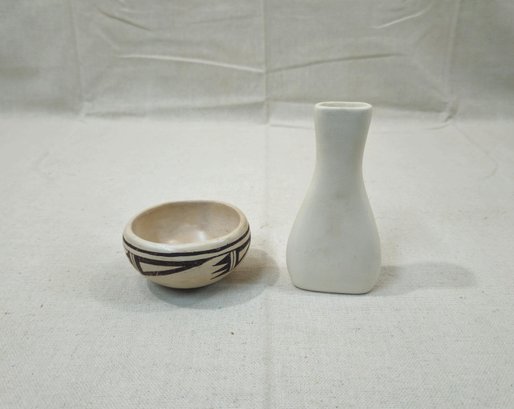 Group of ~2 assorted Native American pottery articles including a Sioux Pottery small vase and a Hopi Pottery small bowl. Both pieces marked on base.