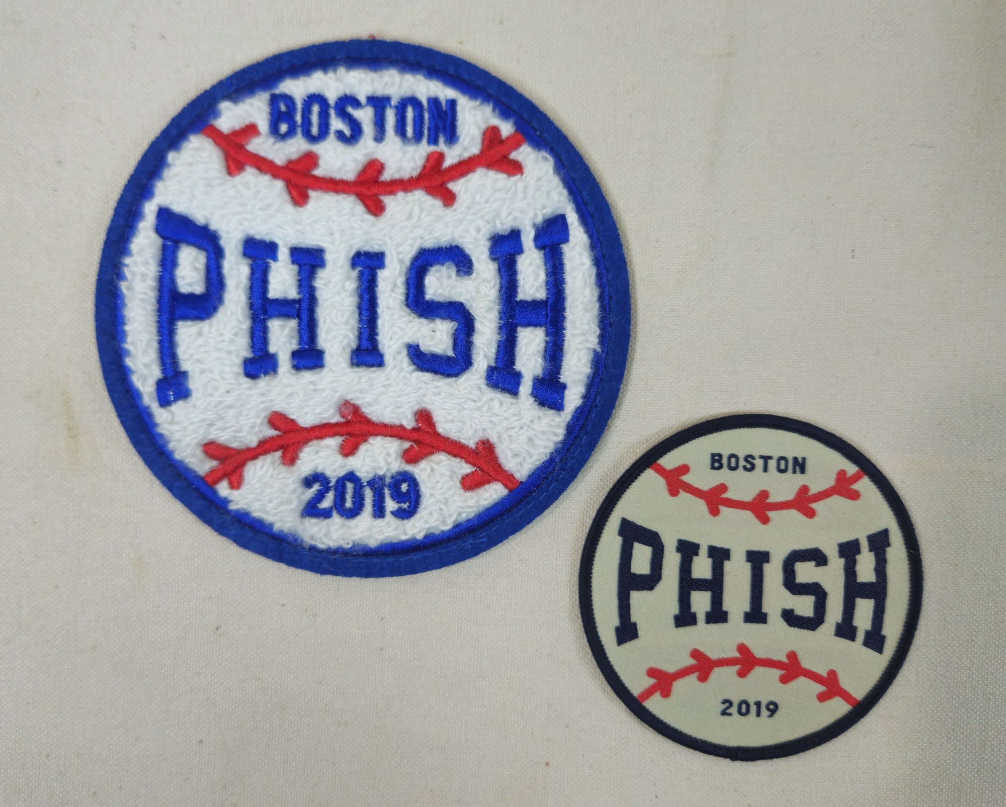 Group of ~2 assorted official Phish Summer Tour Fenway Park, Boston, MA patches including a small iron-on baseball patch and an Oxford Pennant baseball patch.
