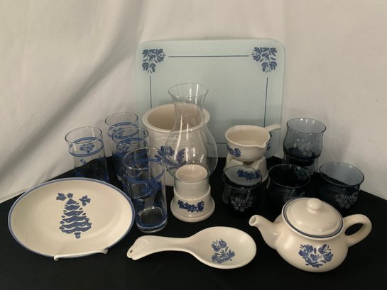 Group of ~18 Pfaltzgraff Blue Yorktowne tableware including 6" utensil crock, tea light candle holder w/shade, butter warmer, spoon rest, small tea pot, cutting board, 9 glasses, and oval blue Christmas tree coupe dish.