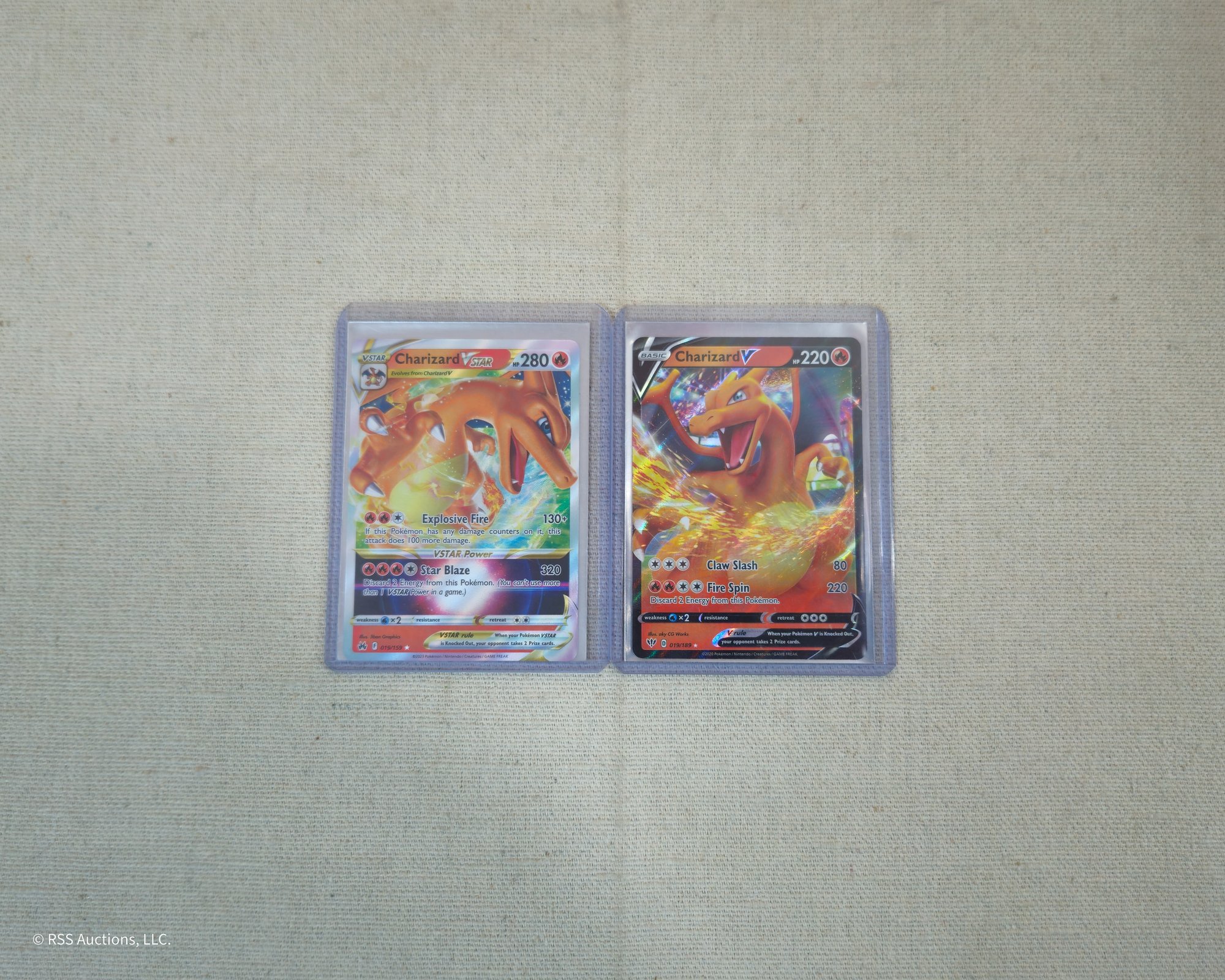 Group of ~2 assorted Pokemon Charizard trading cards including a Sword & Shield: Charizard VStar #019/159 and a Sword & Shield: Darkness Ablaze Charizard V #019/189.