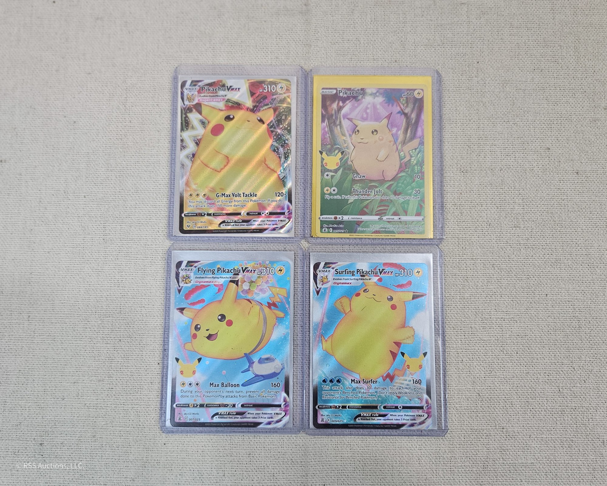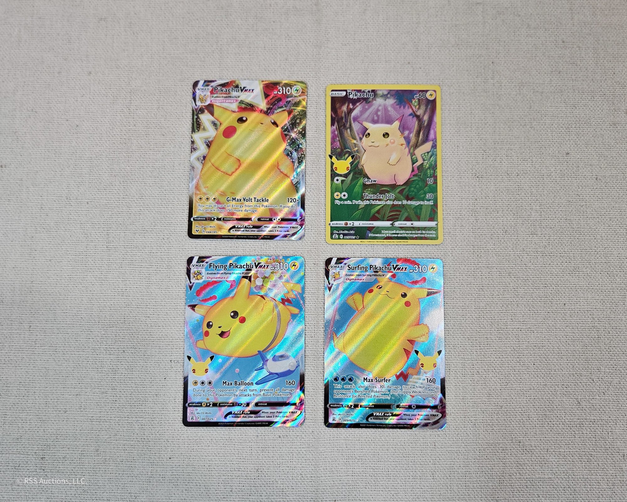 Group of ~4 assorted Pokemon Pikachu trading cards including a Celebrations Flying Pikachu VMax #007/025, a Celebrations Surfing Pikachu VMax #009/025, a Sword & Shield: Vivid Voltage Pikachu VMax #044/185, and a Celebrations Pikachu #005/025.