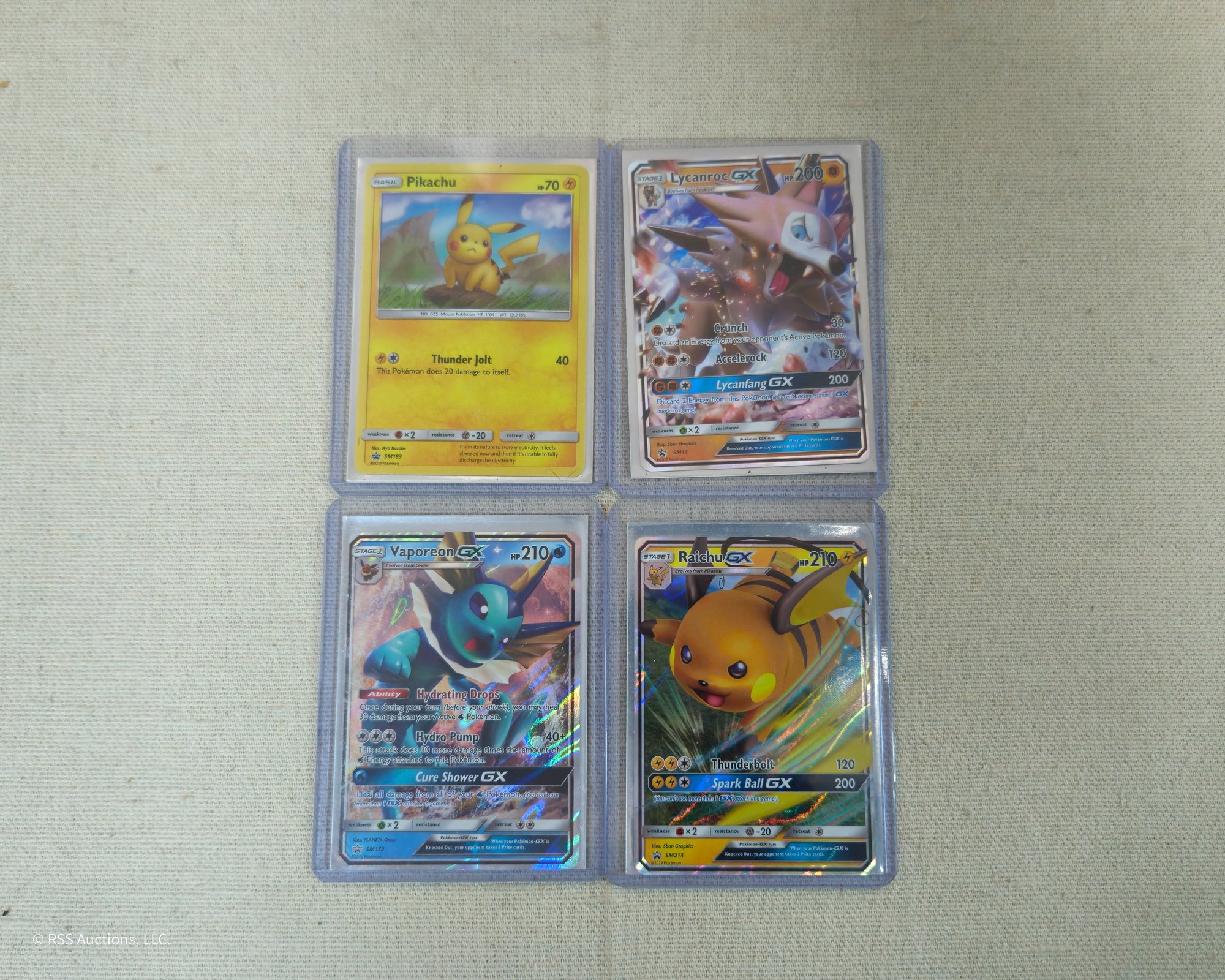 Group of ~4 assorted Pokemon Sun & Moon Promos trading cards including a Pikachu #SM183, a Lycanroc GX #SM14, a Vaporean GX #SM172, and a Raichu GX #SM213.