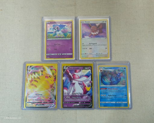 Group of ~5 assorted Sword & Shield Promos trading cards including a Galarian Ponyta #SWSH013, an Eevee #SWSH127, a Pikachu VMax #SWSH286, a Dark Sylveon V #SWSH134, and a Vaporean #SWSH072.