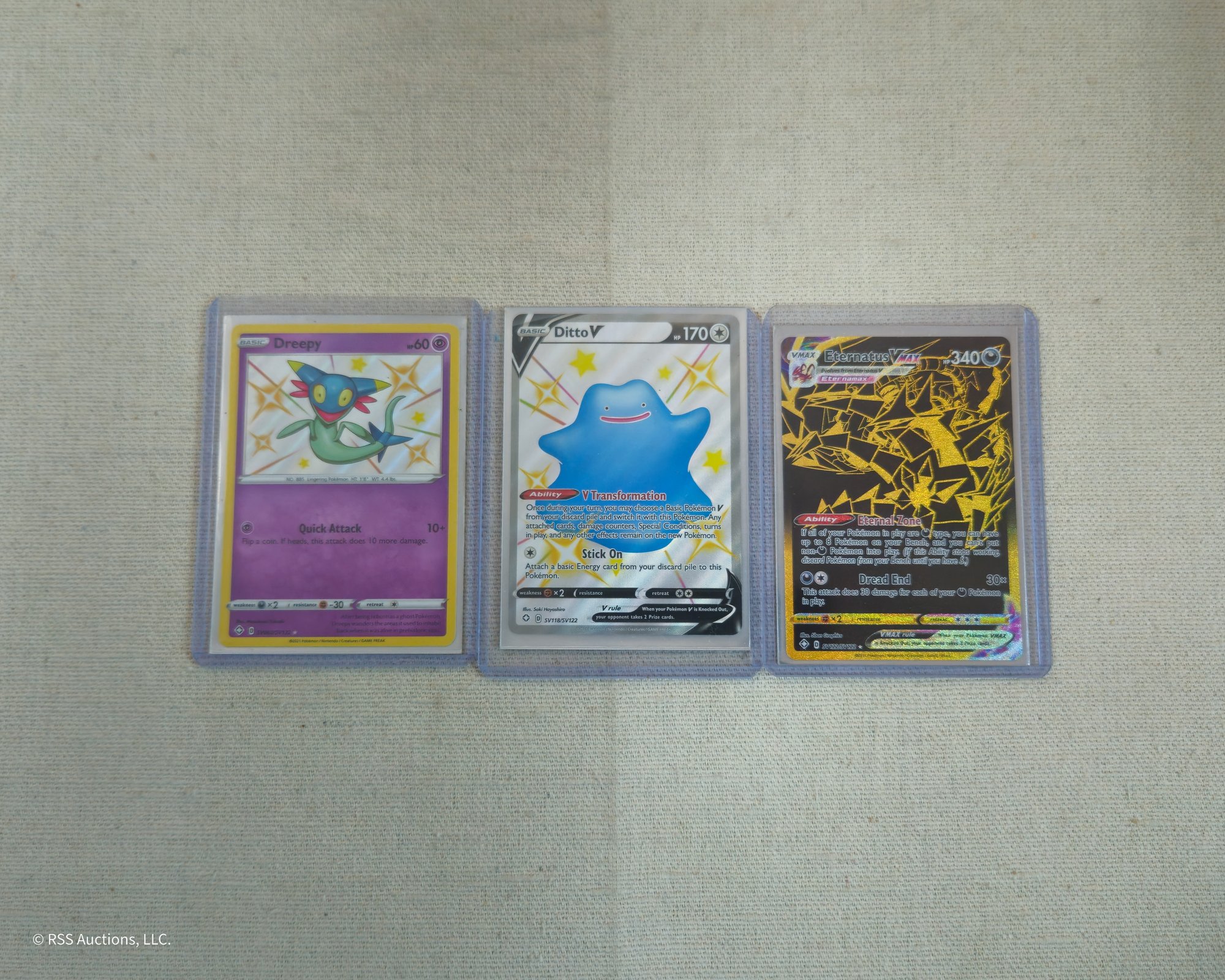 Group of ~3 assorted Pokemon Sword & Shield: Shining Fates Shiny Vault trading cards including a Dreepy #SV060/SV122, a Ditto V #SV118/SV122, and an Eternatus VMax #SV122/122.