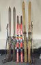 Group of primitive wooden skis including 2 adult sets with bindings & poles, a pair of child's skis, and a pair of youth Hart Gremlin skis & bindings.