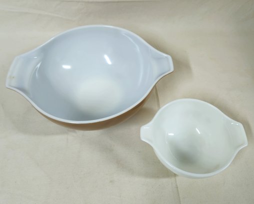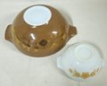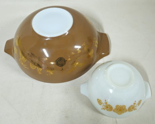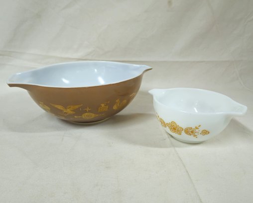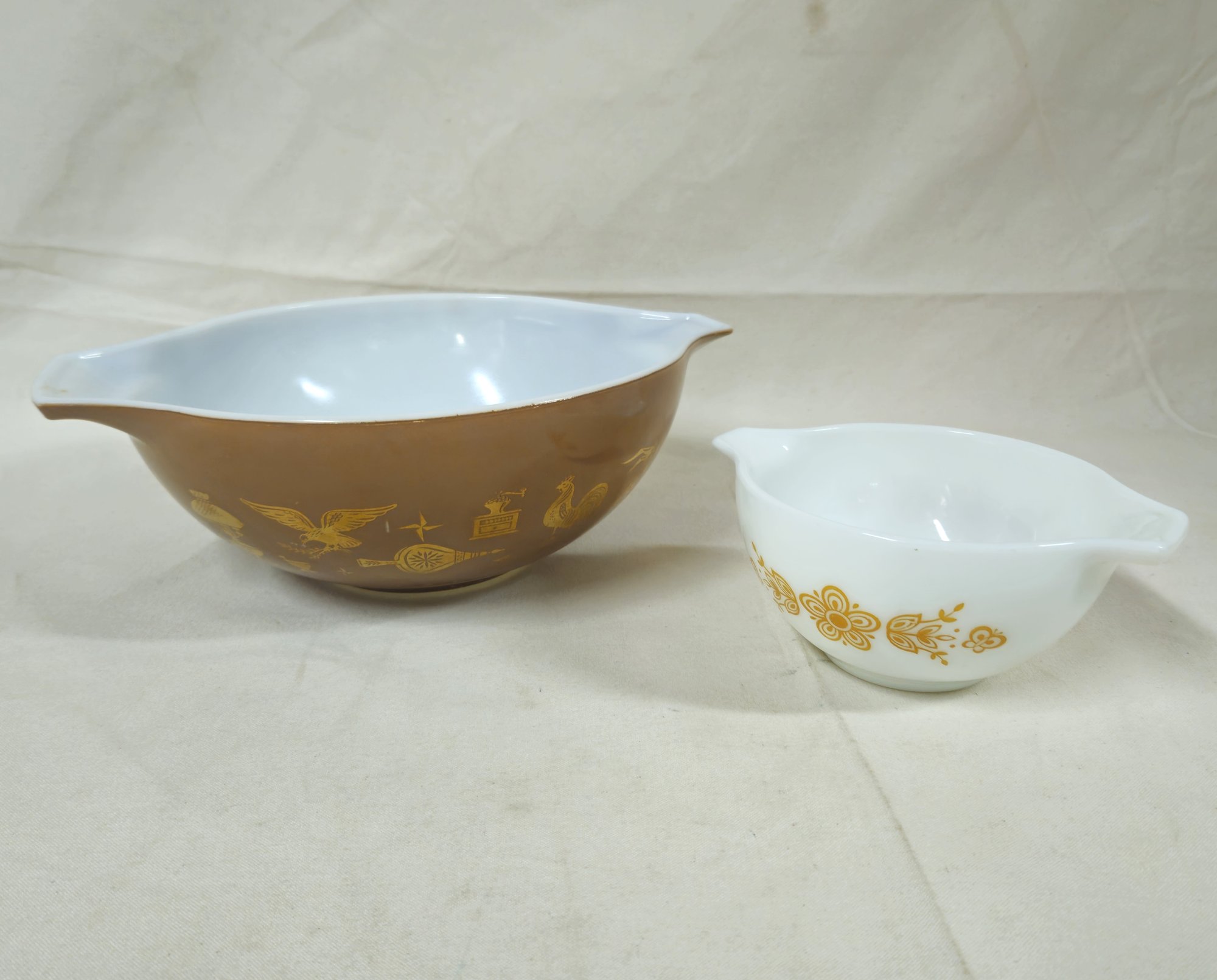 Group of ~2 assorted Pyrex Cinderella mixing bowls including an Early American 4qt.- 444 bowl & a Butterfly Gold 1 1/2pt.- 441 bowl. Produced by Corning.