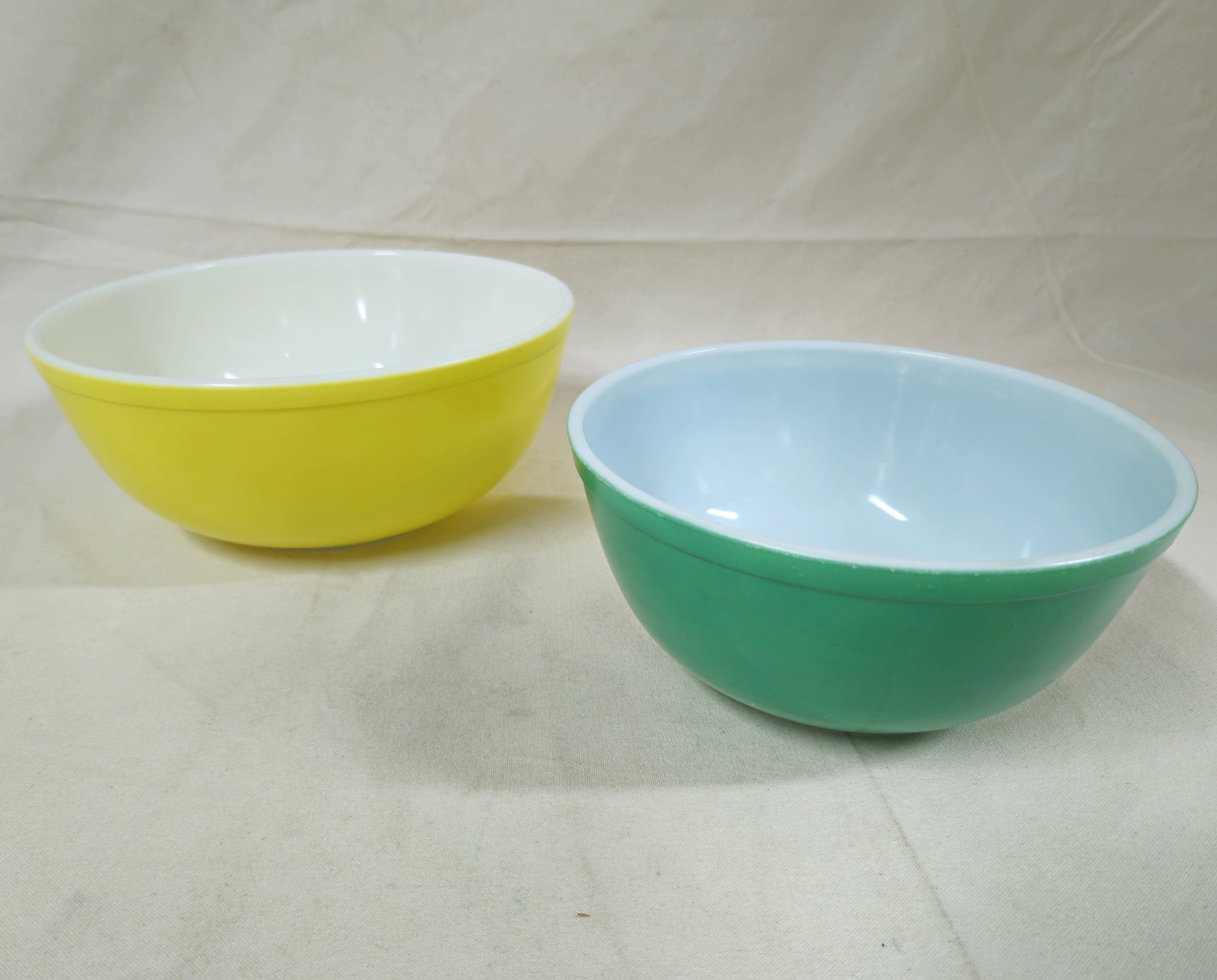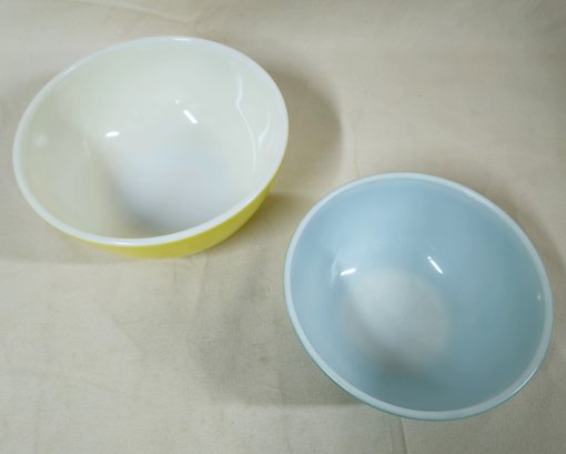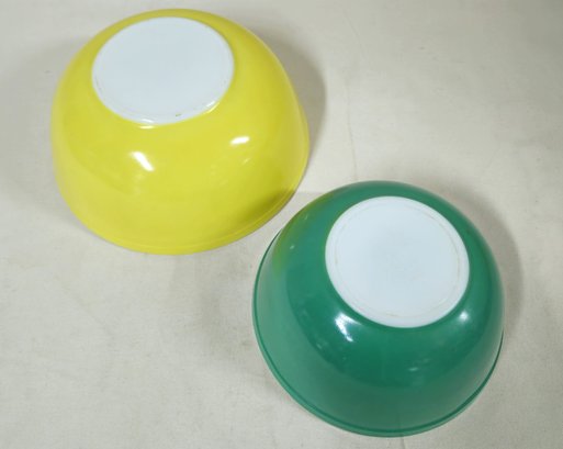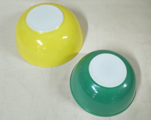 Group of ~2 assorted Pyrex Primary Color mixing bowls including a Yellow 4qt- 404 bowl & Green 403 bowl. Produced by Corning Glass Works.