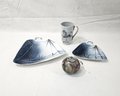 Group of assorted contemporary studio art pottery including a mug, a figural container with lid, and a pair of fan shape dishes. Mug signed with incised Scheier on base. Figural container signed with incised Raye on base. Dishes signed with incised Ann Elizabeth on base.