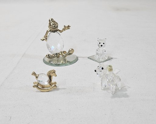 Group of assorted small crystal figurines including a clown, a bear, dog, and a rocking horse. Various makers.