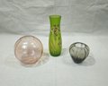 Group of ~3 assorted antique or vintage art glass bud vases including an art nouveau green glass vase with enameled iris flowers, a pink iridescent rose bowl, and a squat smoky grey vase.
