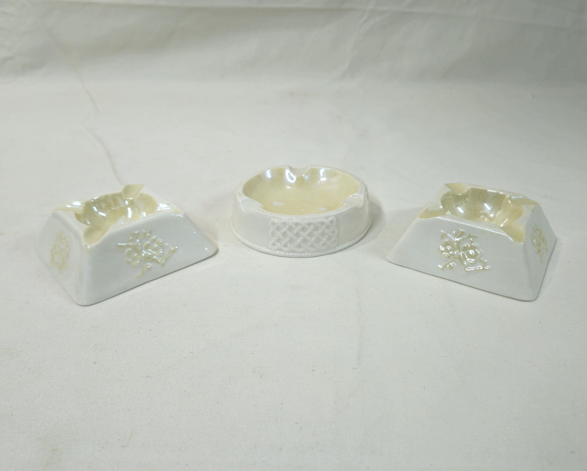 Group of ~3 assorted porcelain ashtrays including 2 Thorn ashtrays and a lattice ashtray. All pieces marked on base with Belleek green stamp logo.