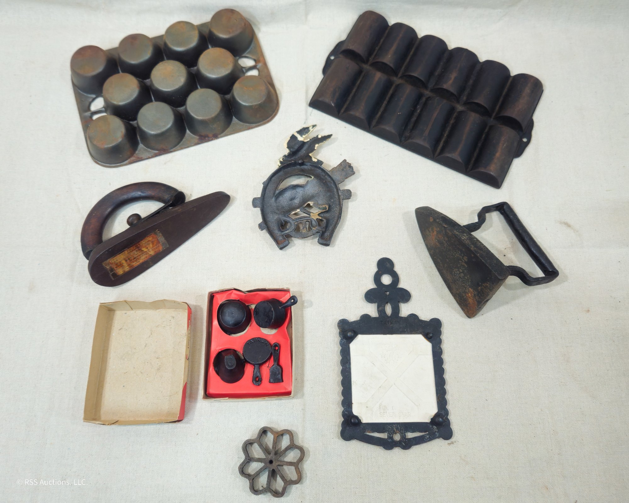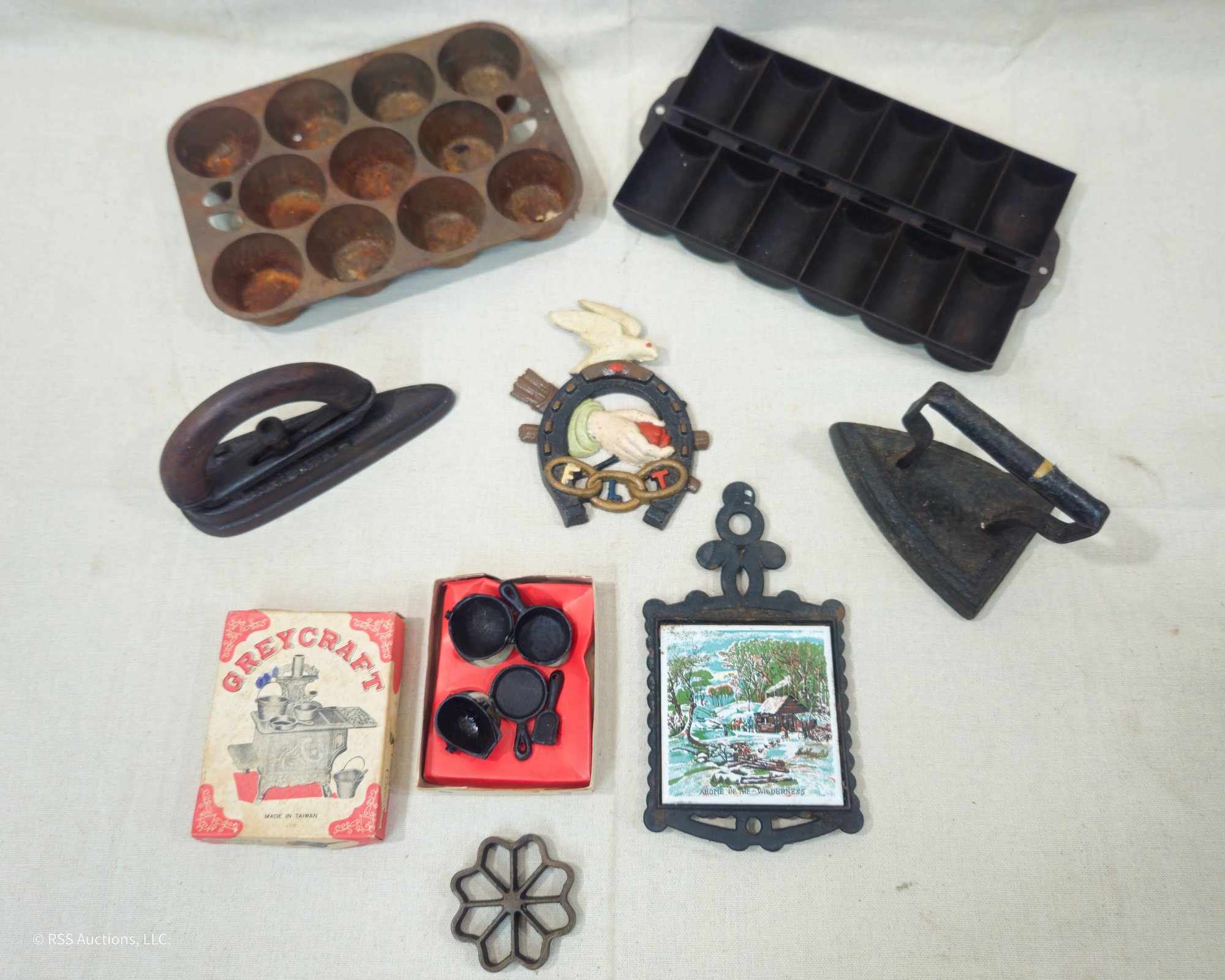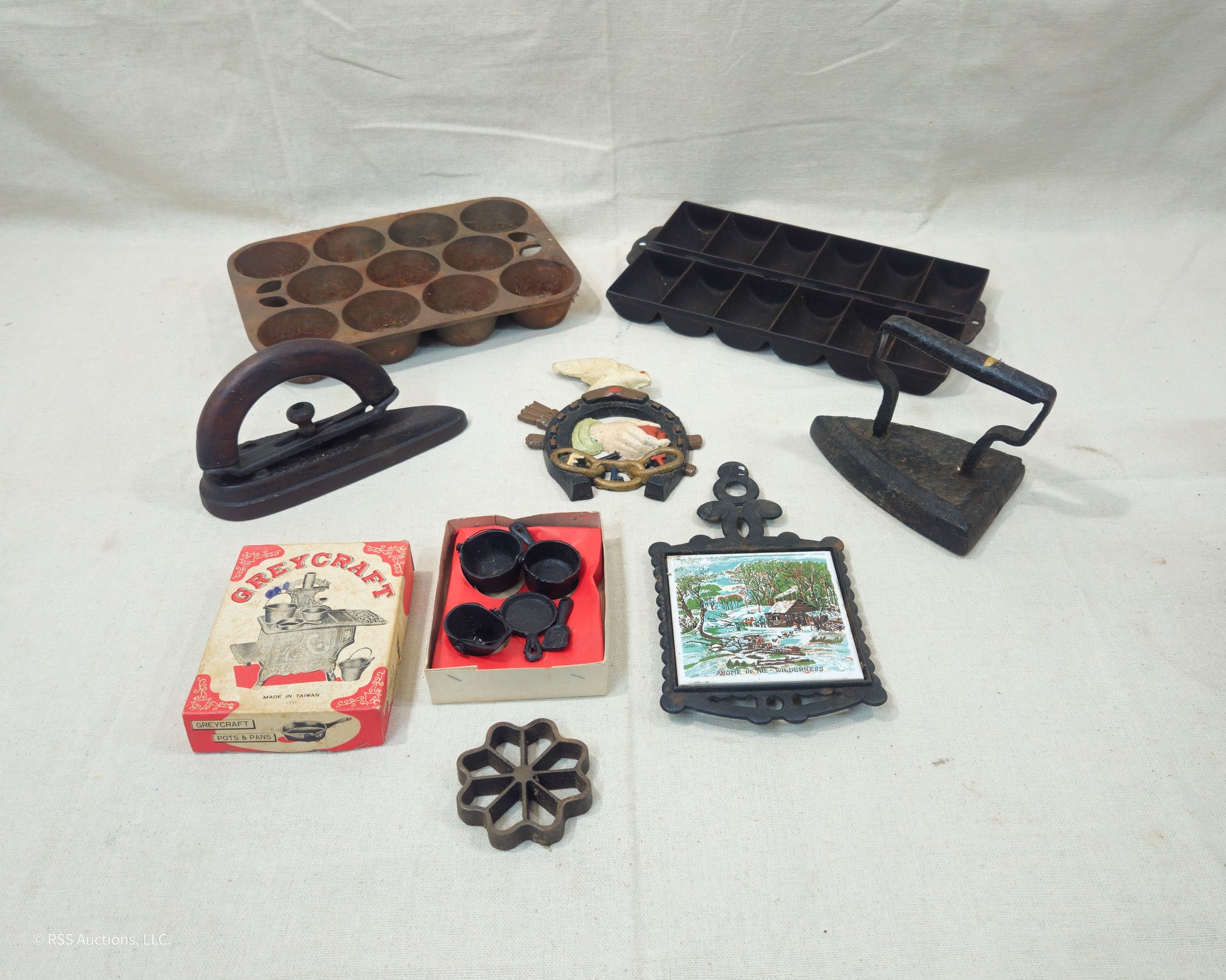 Group of ~8 assorted vintage cast iron ware including a muffin pan, a popover pan, 2 sad irons, a Greycraft child's toy pan set, and others.