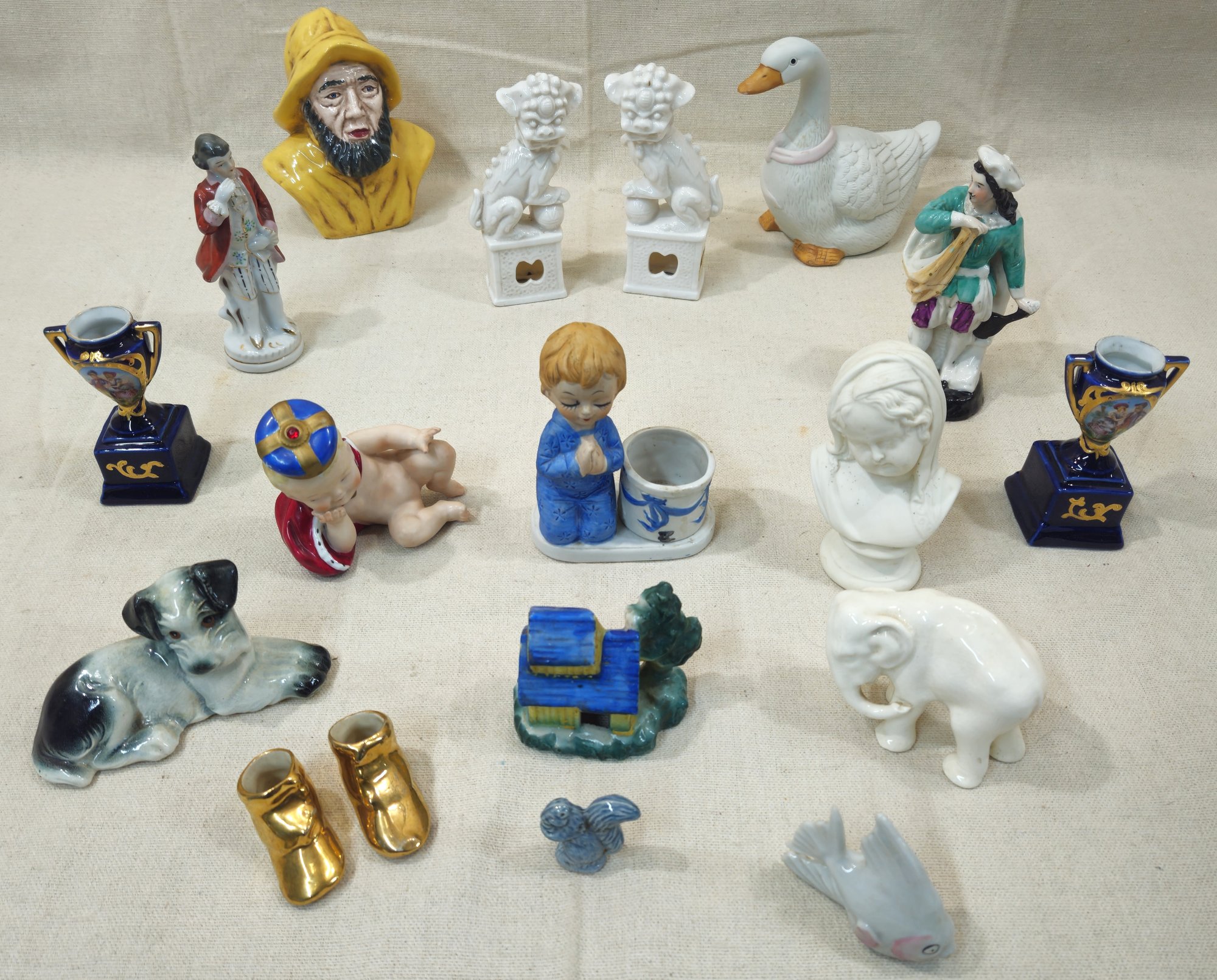 Group of assorted vintage ceramic figurines includes various subjects such as an "Old Salt" fisherman bust, a goose, a dog, an elephant, Foo dogs, two small trophies, and several human figures.